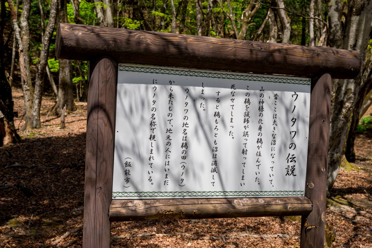 そんな疑問に答えるかのように、由来を示した案内板がしっかりと設置してありました。かつてこの場所には沼があり、神様の化身の鵜が住んでいたとのことです。鵜が住んでいるタワだからウノタワと言う、何のひねりも無いそのままな名称でした。