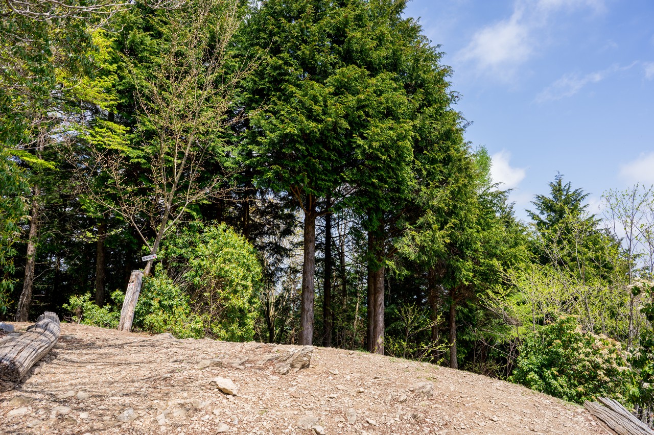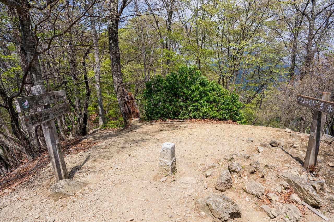 山頂は狭く展望もありません。ただの通り道と言ったところです。腰掛けられるようなものも無いので、昼食休憩をするのであれば、山頂ではなく先ほどの妻坂峠方面との分岐地点でとる方が良いと思います。