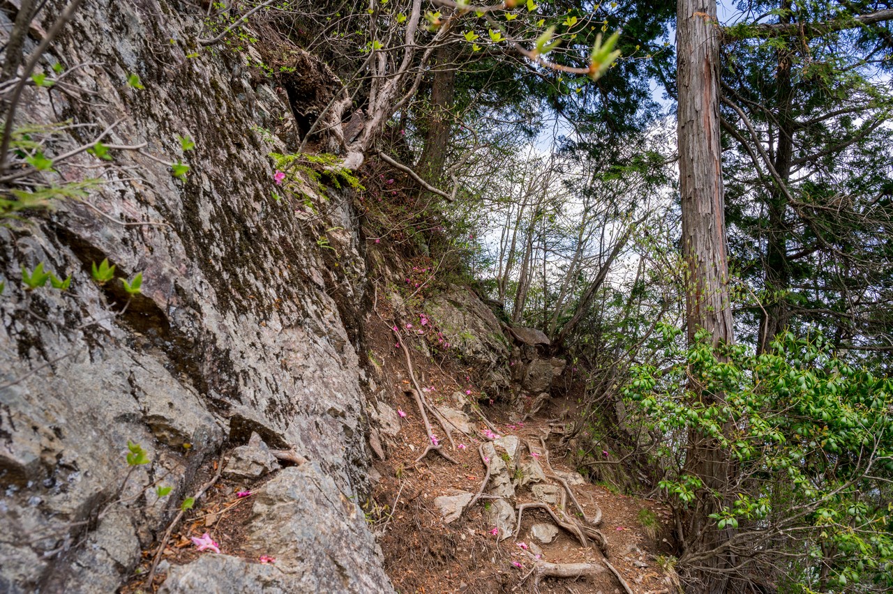 岩壁の右側から回り込むようにして登ります。道の右側は断崖絶壁で、足元がかなり細くなっているので注意を要します。