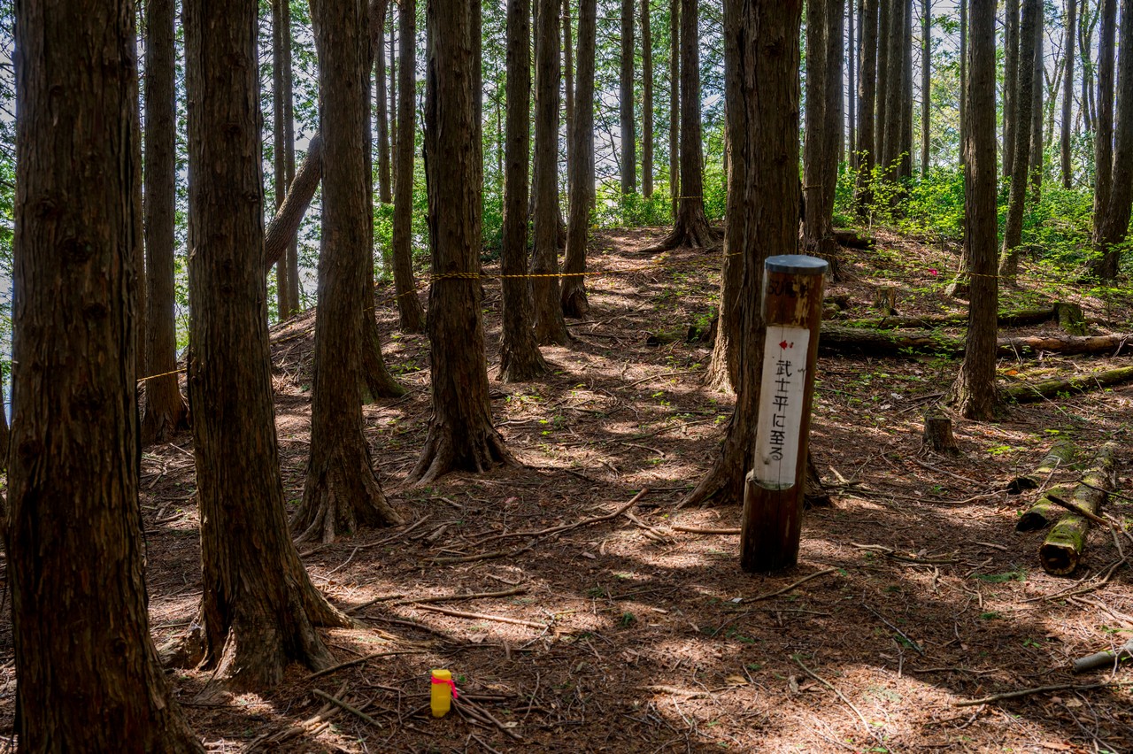 いつの間にか自然林はなくなり、周囲は再び奥武蔵らしい薄暗い杉の植林になりました。一般登山道すらも存在しないような尾根上にまで、こうして隙間なく植林されていることが驚きです。将来的にどうやって搬出するつもりだったのでしょうか。