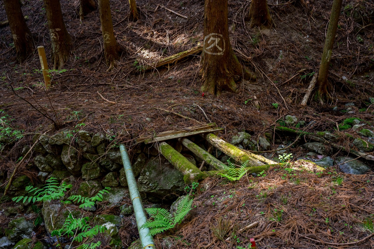現在すでにほぼ歩かれてはいないらしく、道中にある木橋は完全に朽ちていました。橋の隣に配管しきものが通っていると言うことは、かつてはこの付近にも人家が存在したのでしょうか。