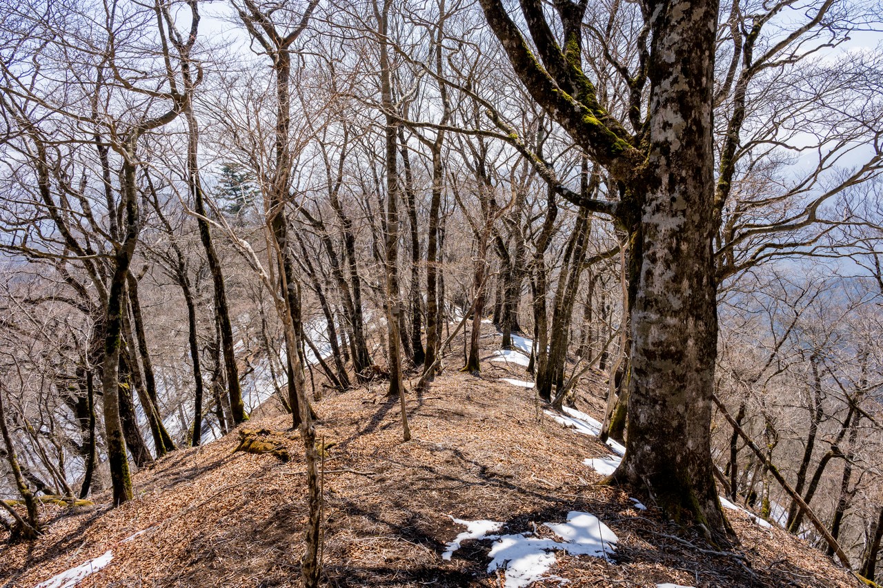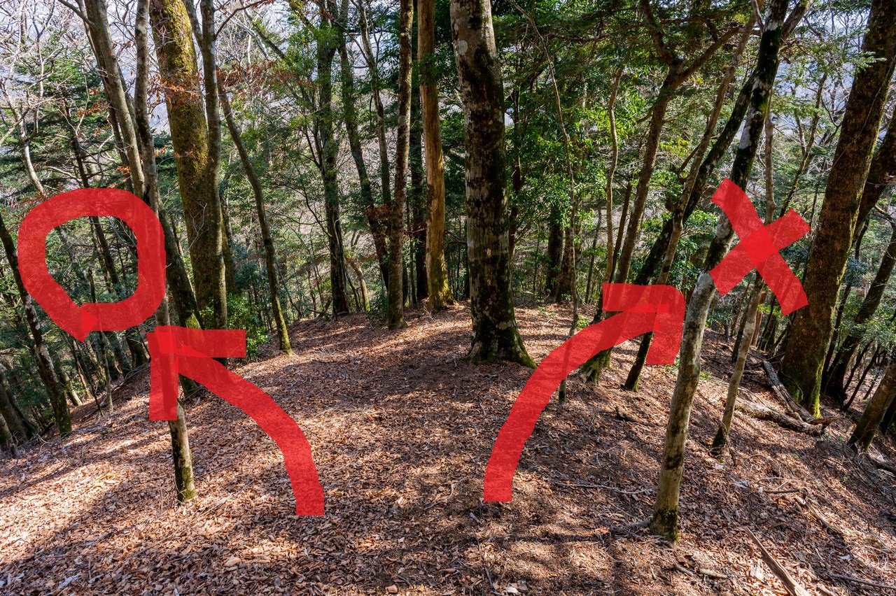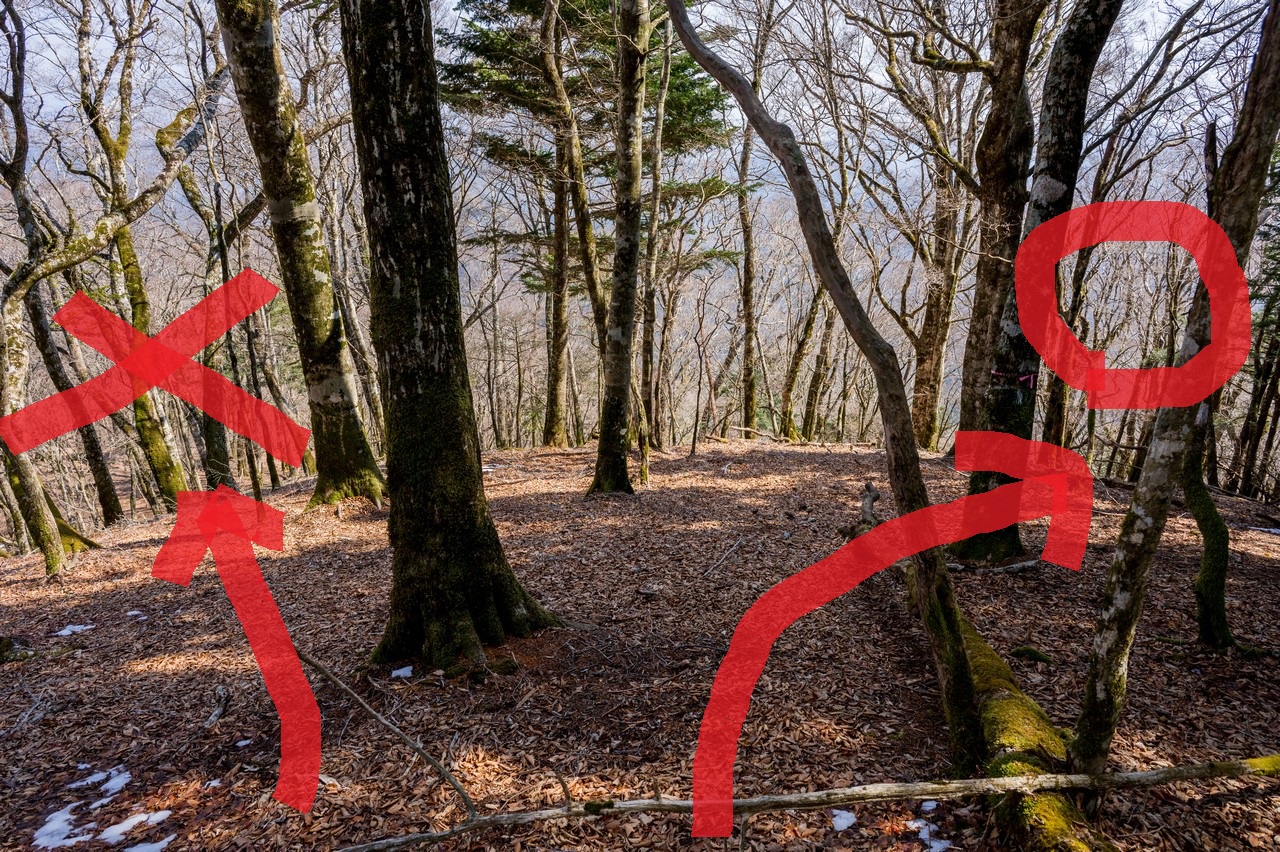 登り返しの途中にトラバースになっている踏み跡らしきものがありますが、こういう頼りないものはすべて無視して尾根筋を忠実に辿るのが正解です。こと破線エリア歩きにおいては、YES直登NOトラバースです。