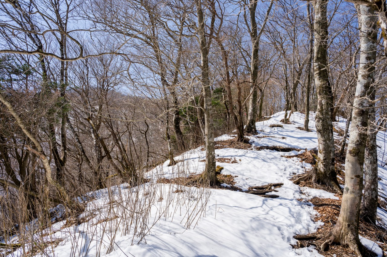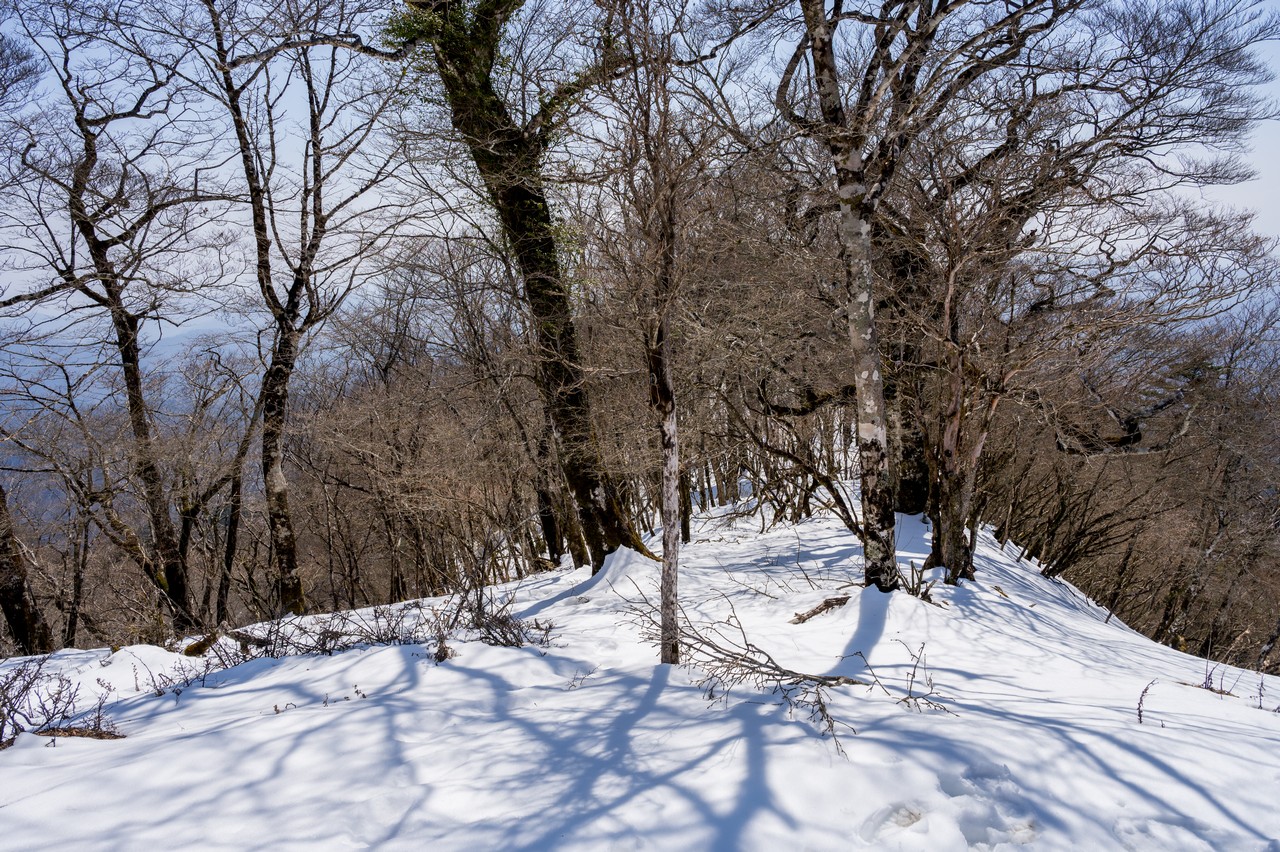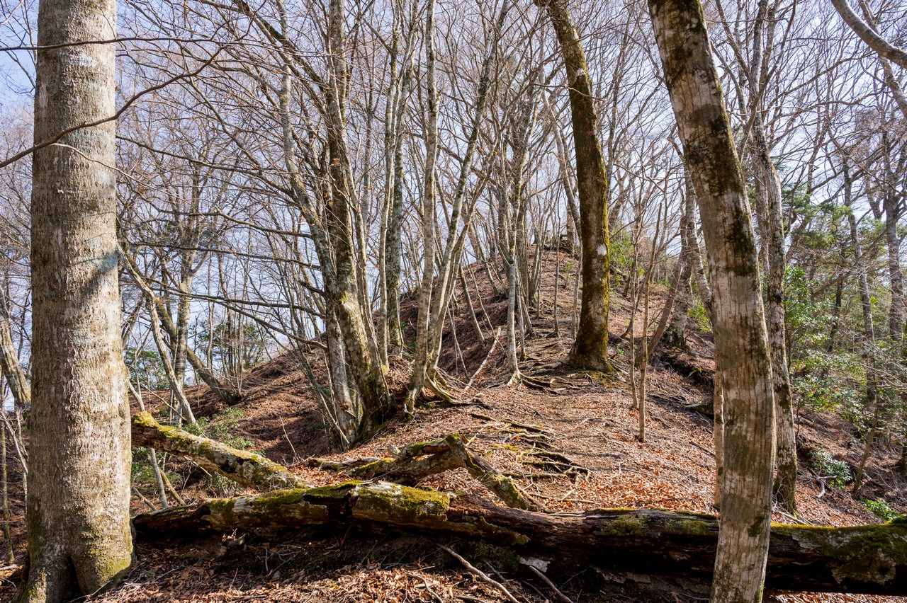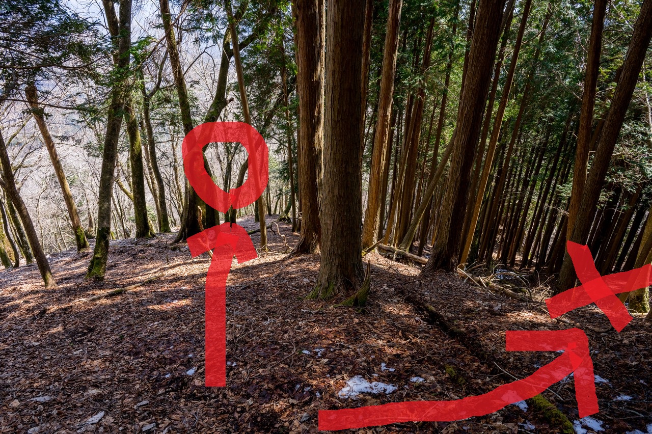 登り返しの途中にトラバースになっている踏み跡らしきものがありますが、こういう頼りないものはすべて無視して尾根筋を忠実に辿るのが正解です。こと破線エリア歩きにおいては、YES直登NOトラバースです。