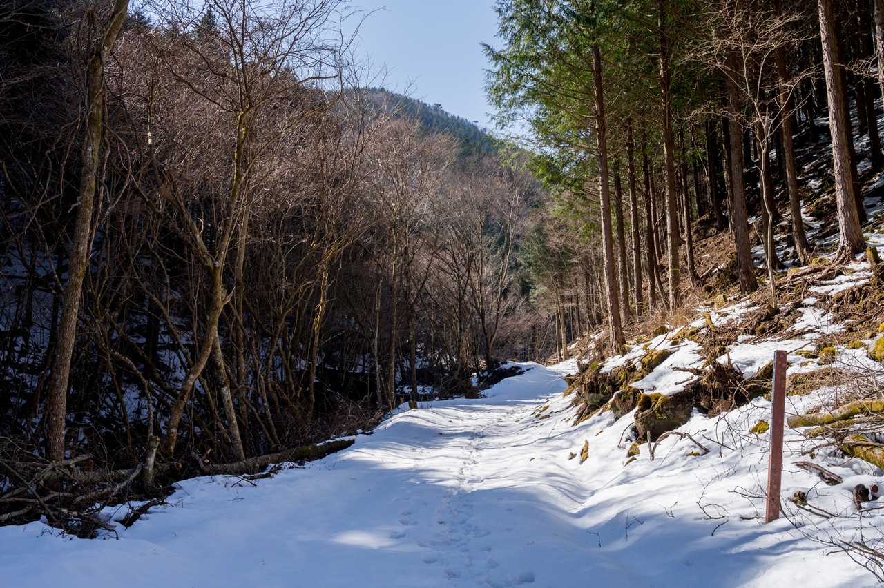 道の上の雪がだいぶ増えて来ました。先行者数人分のトレースが付いています。道志村側からの菰釣山は相当マイナーなルートだと思いますが、それでも歩く人はいるにはいるようです。