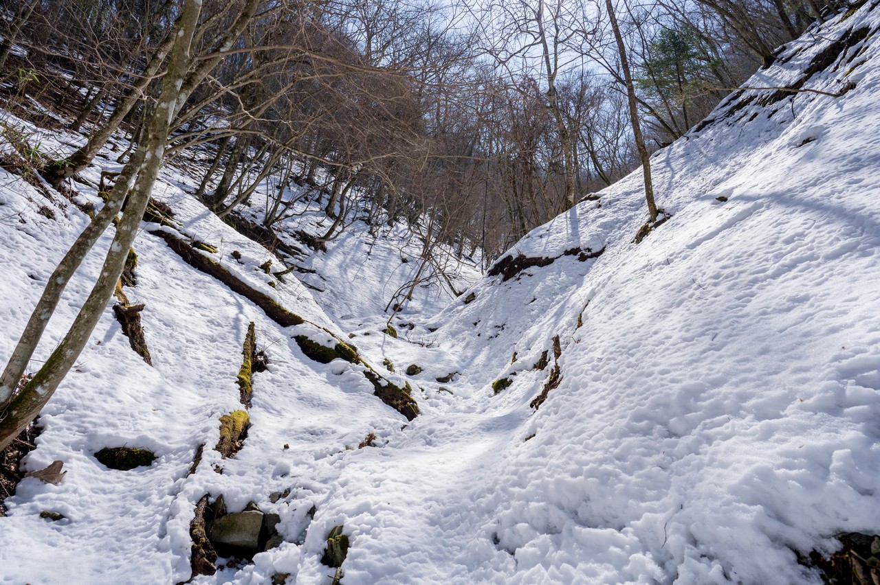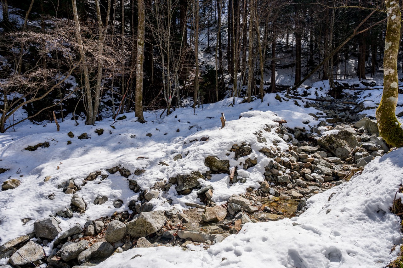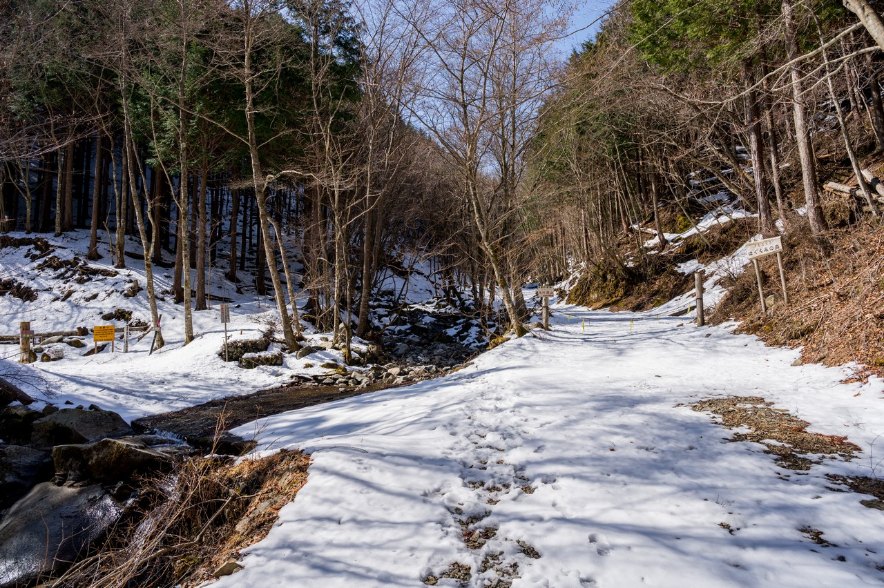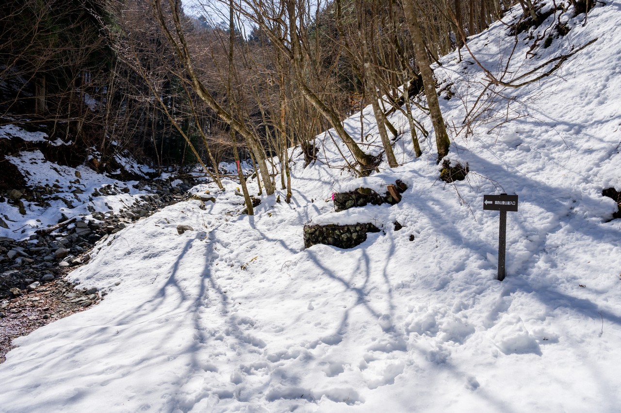 すぐに渡渉箇所がありました。雪の上に先行者の付けたトレースがあるおかげですぐにわかりましたが、それが無い状態だと少々わかりづらいかもしれません。