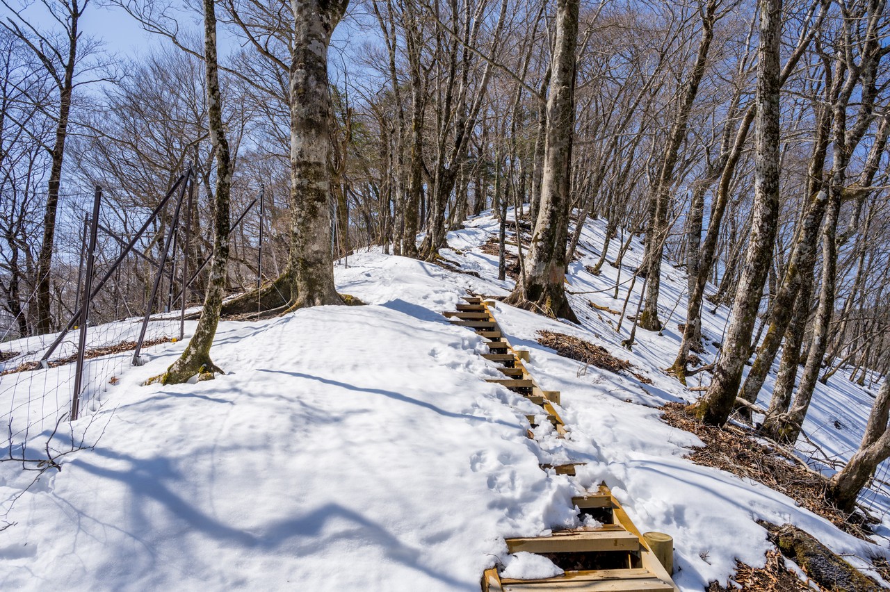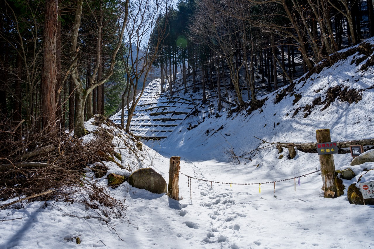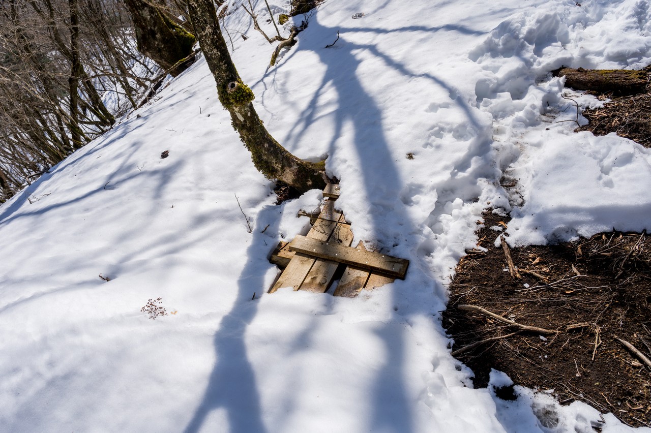 予想の通り、急斜面上を鋭角な九十九折で強引によじ登るように道が続いていました。ここまでずっと滑り止め無しの状態で登って来ていましたが、流石にここでチェーンスパイクを履きました。