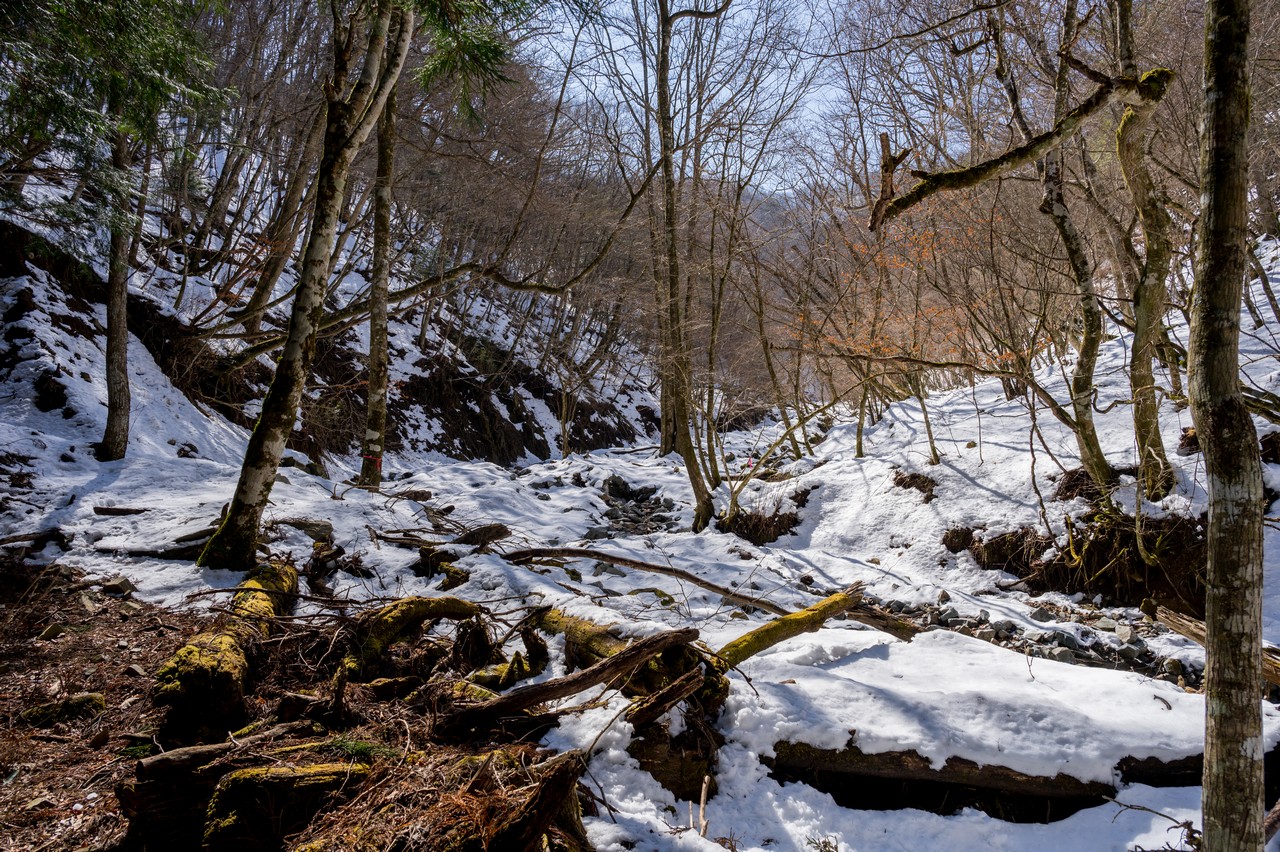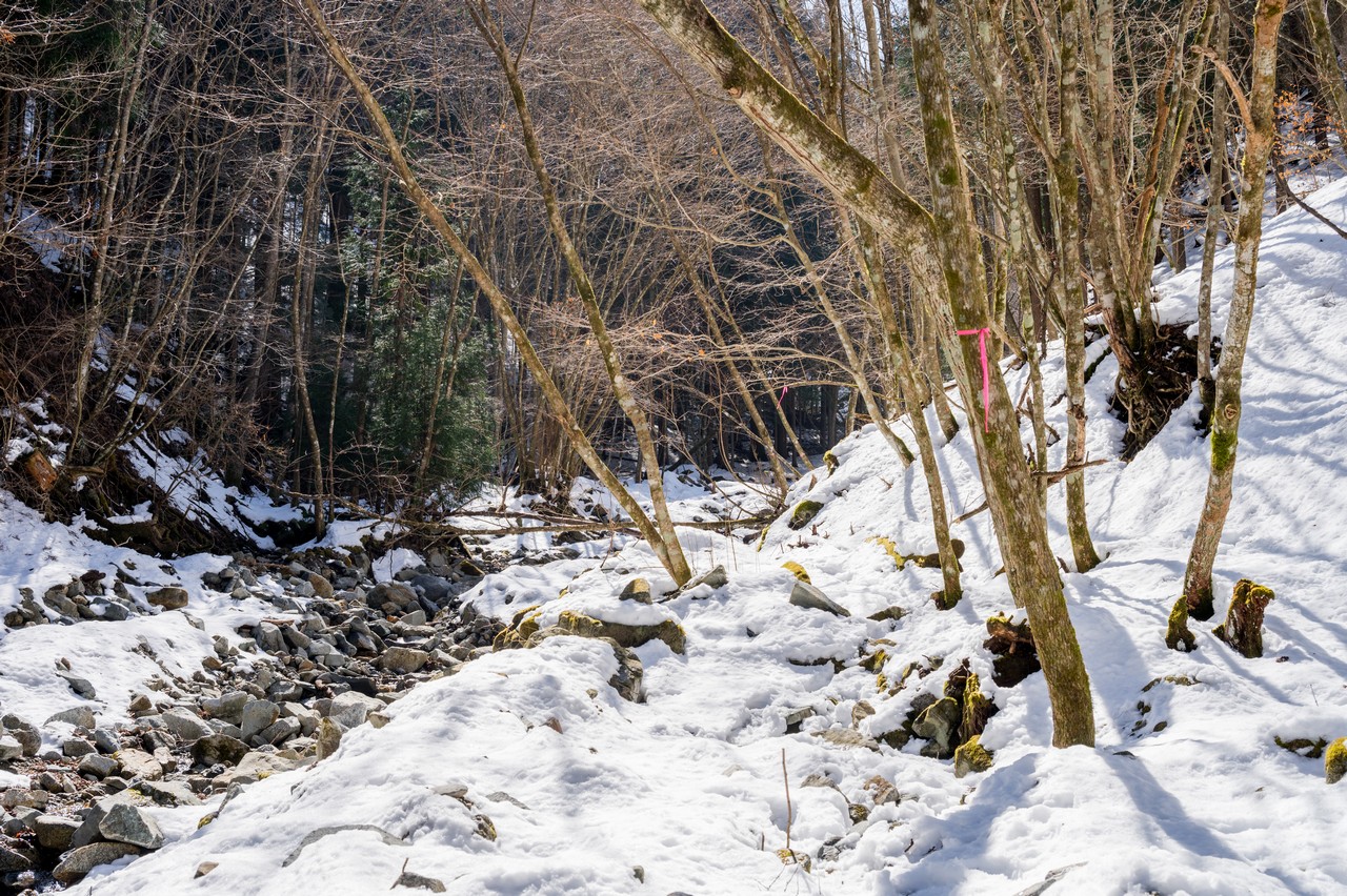 雪が積もっているため踏み跡の状態がどんな感じなのかは全く分かりませんが、沢沿いに目印のピンクテープが並んでいます。その導きに従って進みます。
