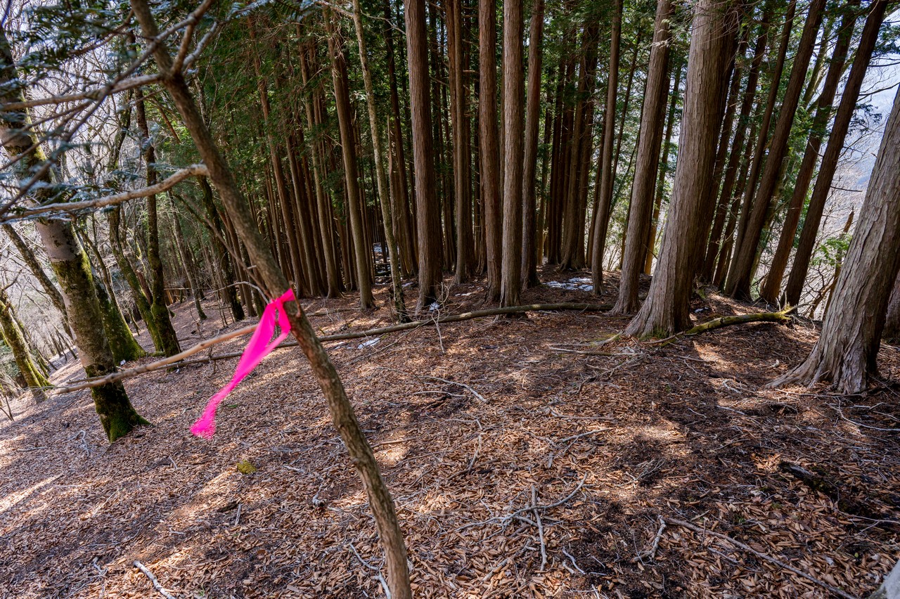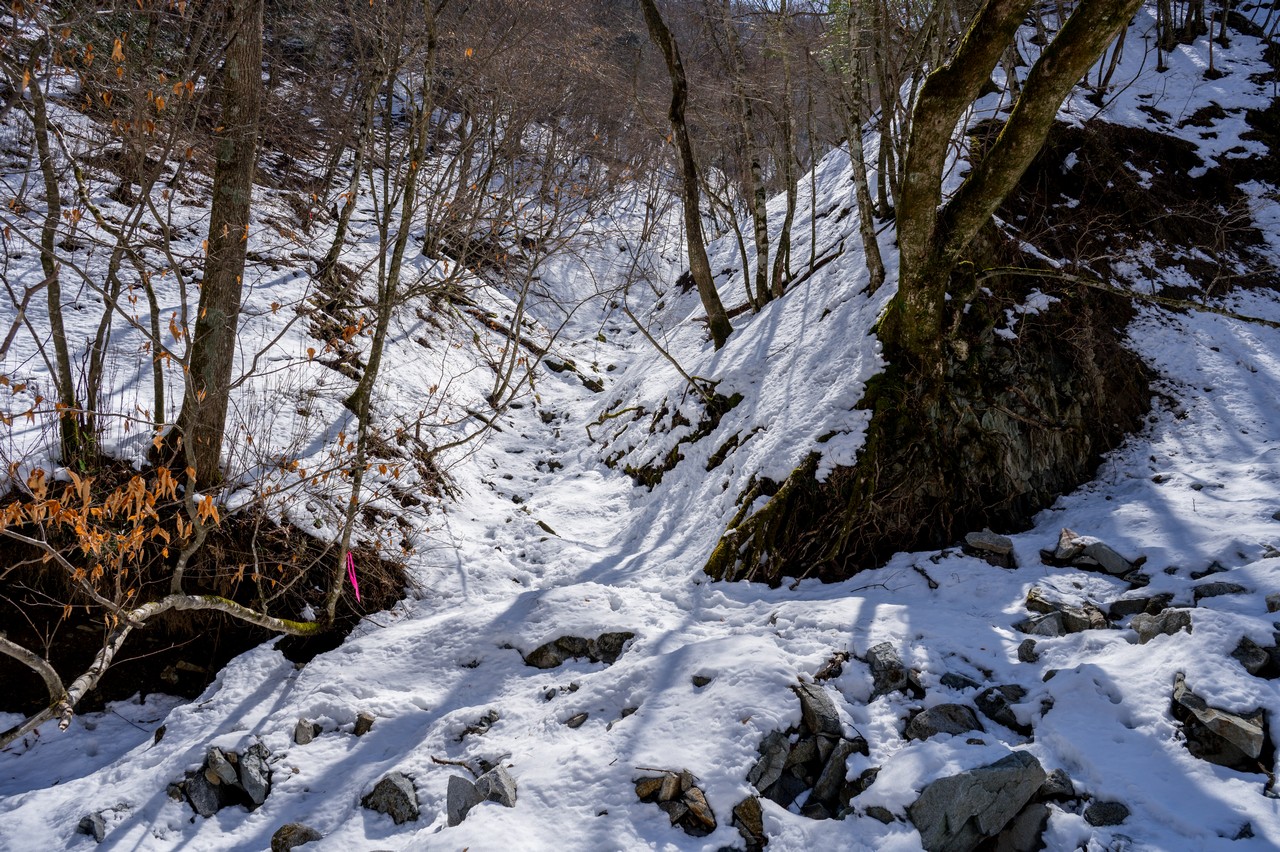 途中から進行方向左手にある支流の小さな谷へ入っていきます。入口に一応は目印のピンクテープがあるのですが、かなりわかりづらいポイントです。見落とさないように、谷沿いを登っている間は常に左側を注視してください。
