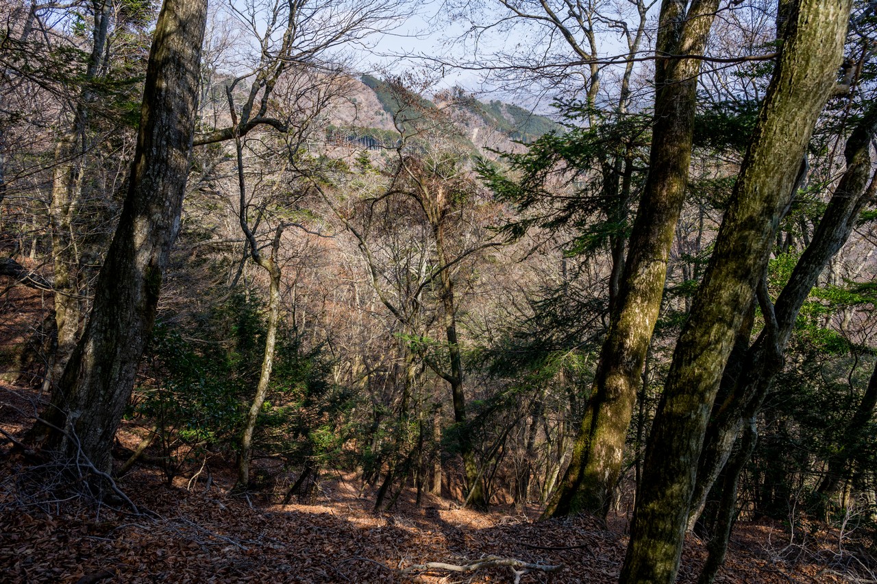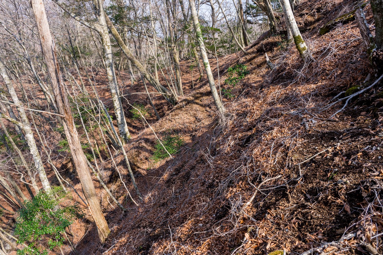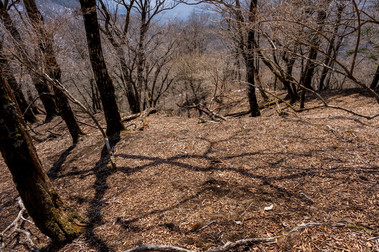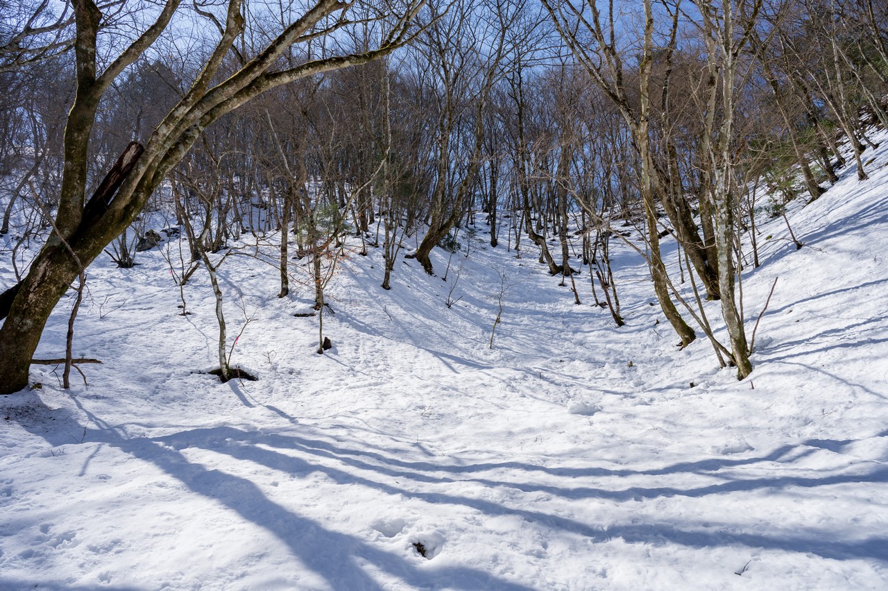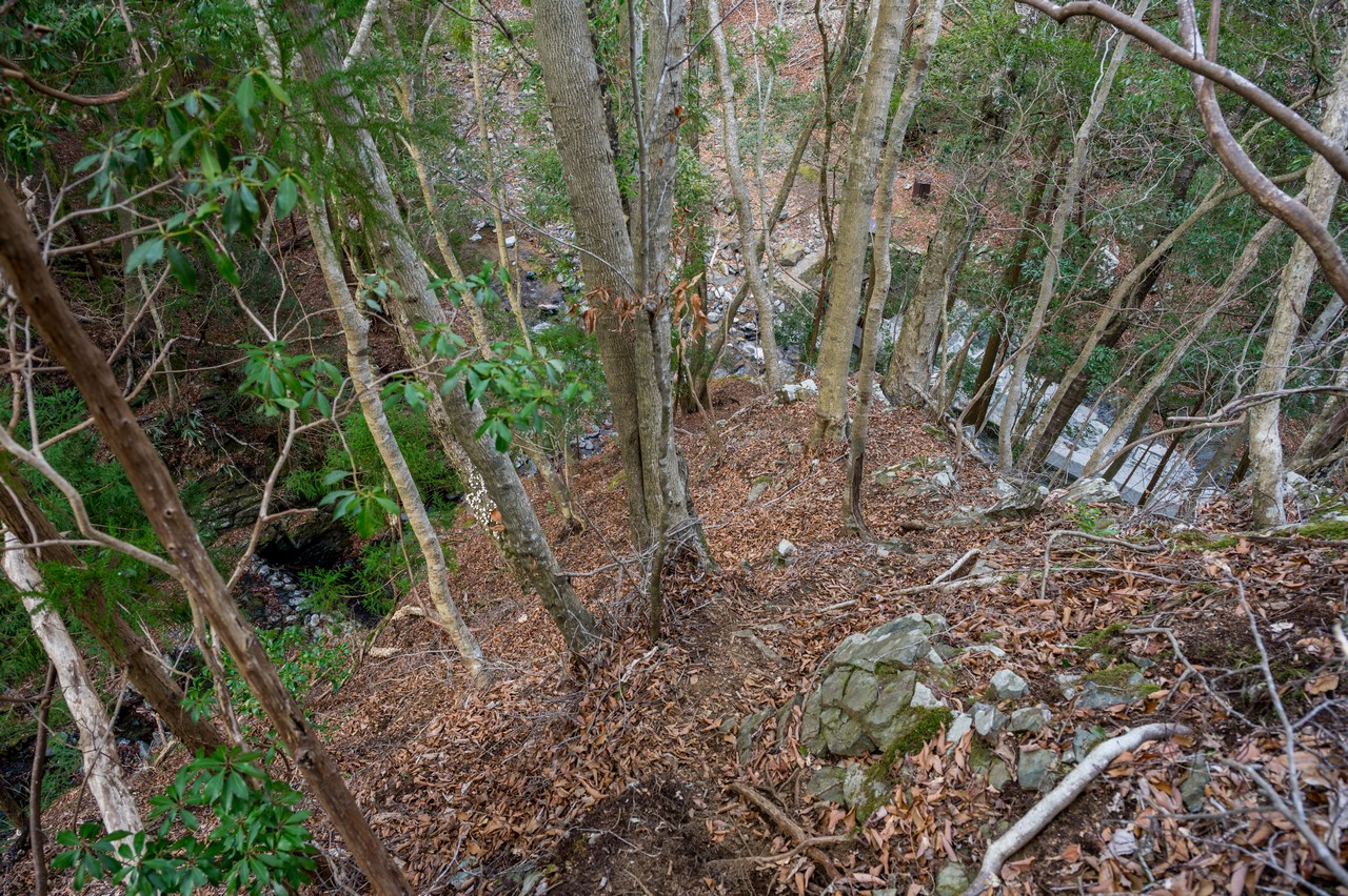 クマ沢ノ頭を過ぎると、転げ落ちるかのような急降下が始まります。道ではない尾根を歩いているだけなので、九十九折れによる勾配の緩和などはありません。一直線です。