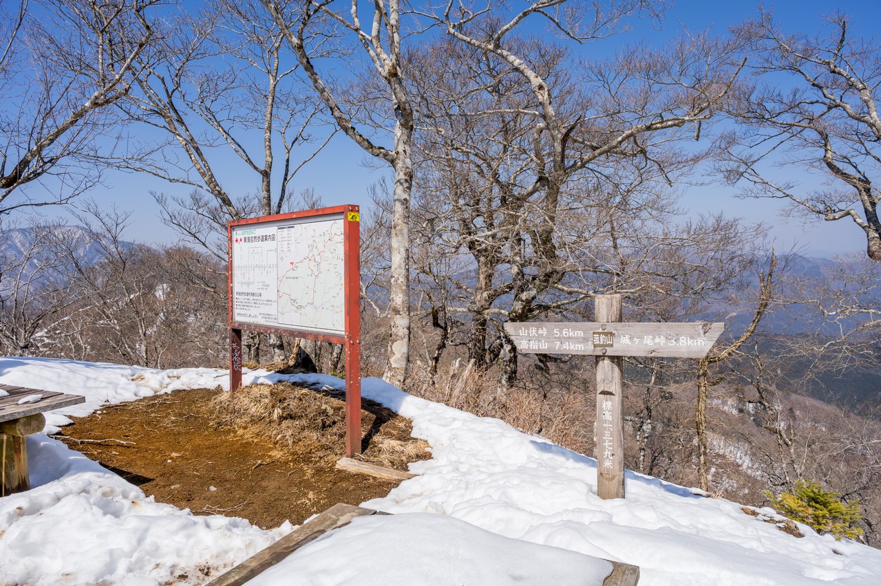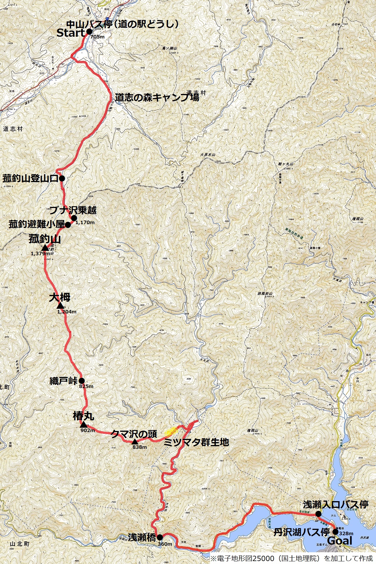 道の駅どうしの最寄りバス停である中山バス停よりスタートして、甲相国境尾根上にある菰釣山に登頂します。菰釣山からは道なき尾根上を南下して、大栂を経て椿丸へ。