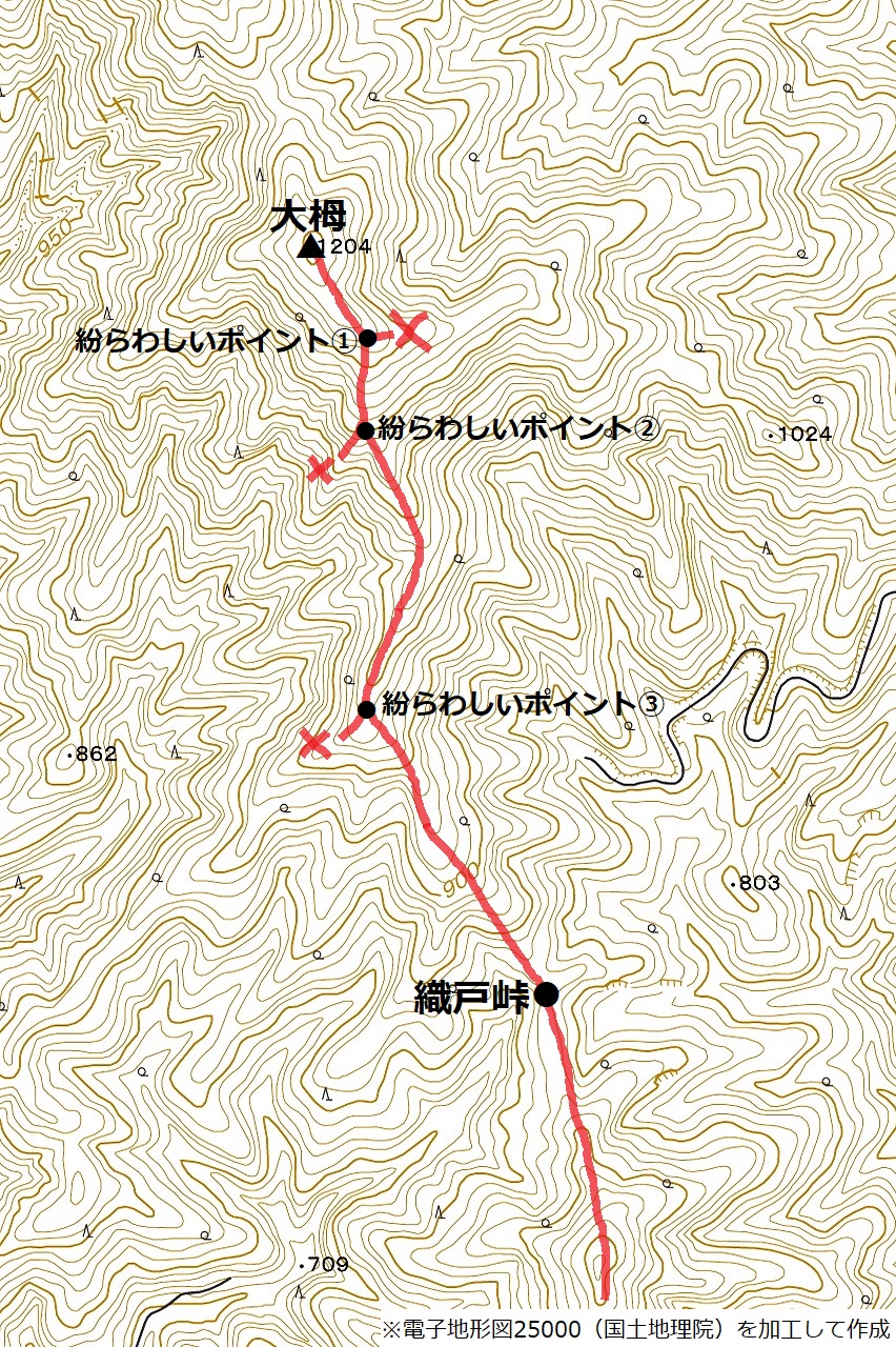 ・ルート上の踏み跡は薄く、道標などの案内はありません。必ず詳細な地形図を携行してください。またGPSの使用を強く推奨します。