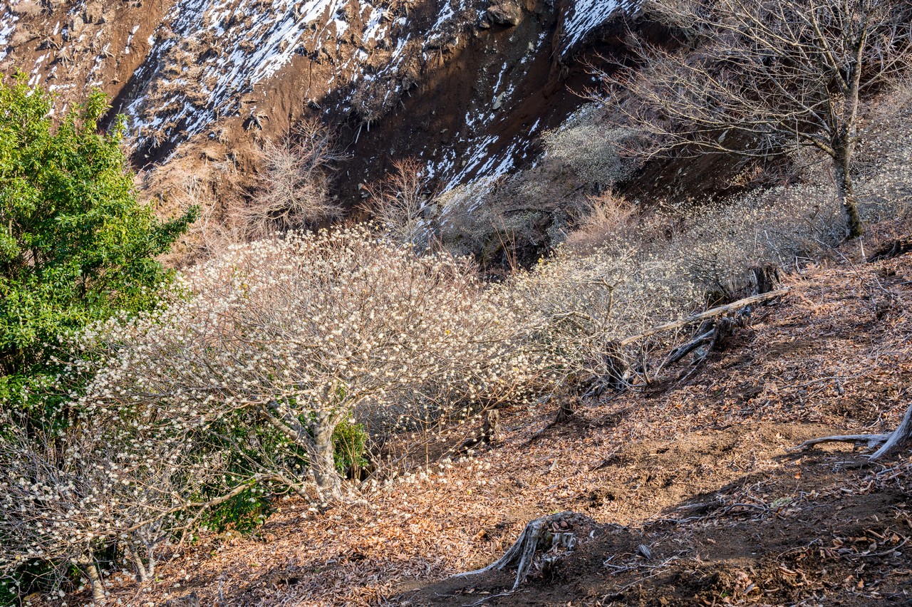 椿丸の山頂直下にある崩落面は、ちょっとしたミツマタの群生地になっています。まだ見頃の時期には早いようで、つぼみ状態から花が僅かに開き始めたばかりの状態でした。