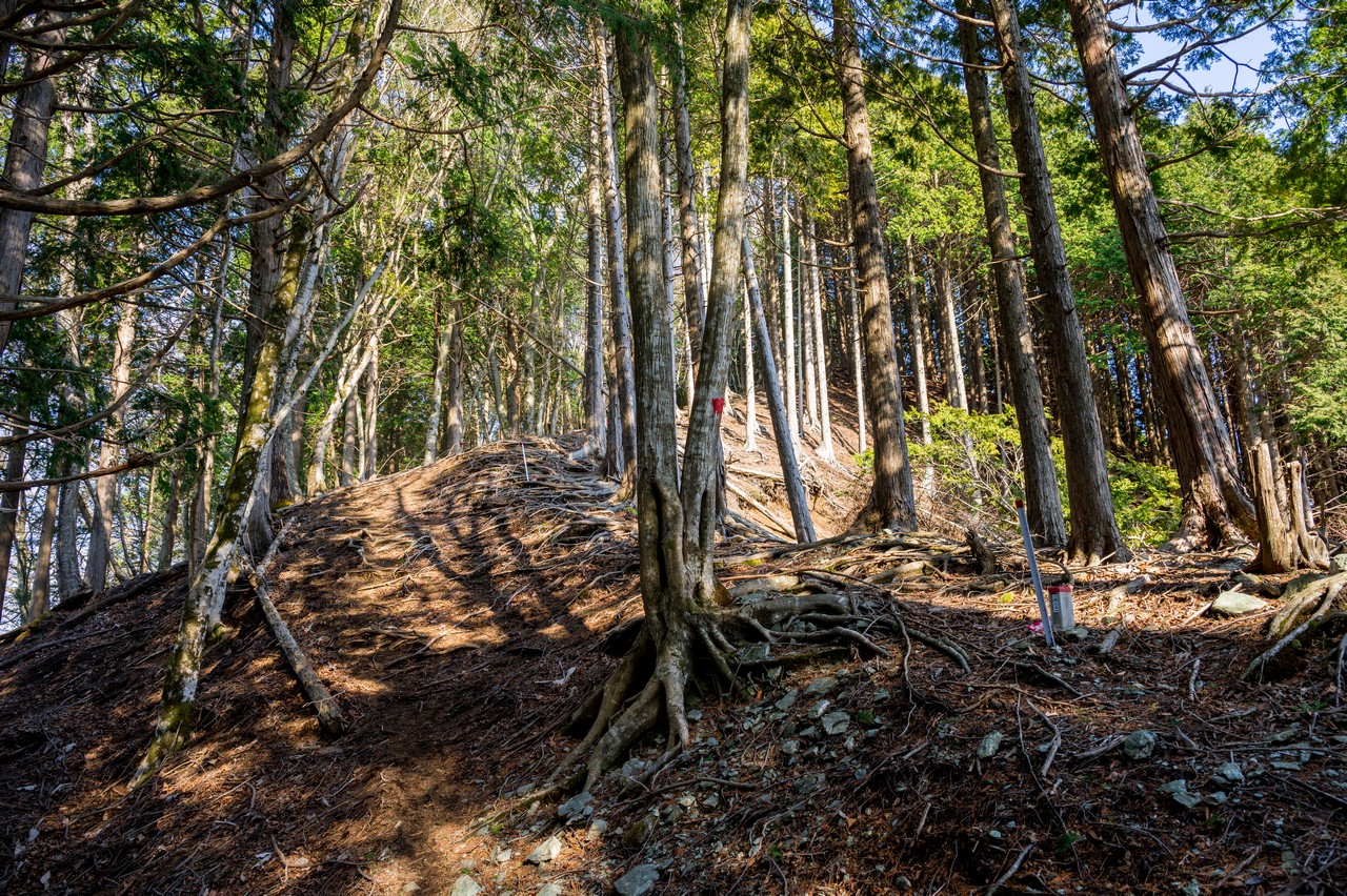 道幅が狭くておっかない急登を登りきると、無事に尾根の上へ出ました。