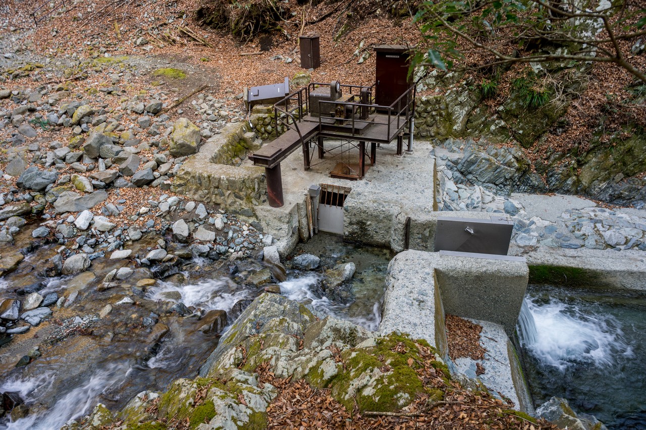 16時 宝行棚沢取水口制水門まで下って来ました。この沢を徒渉する必要がありますが、水門のコンクリートの上を跨ぐのが一番簡単な方法です。