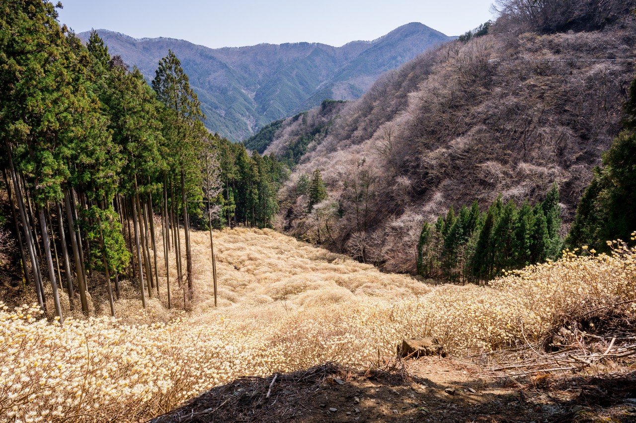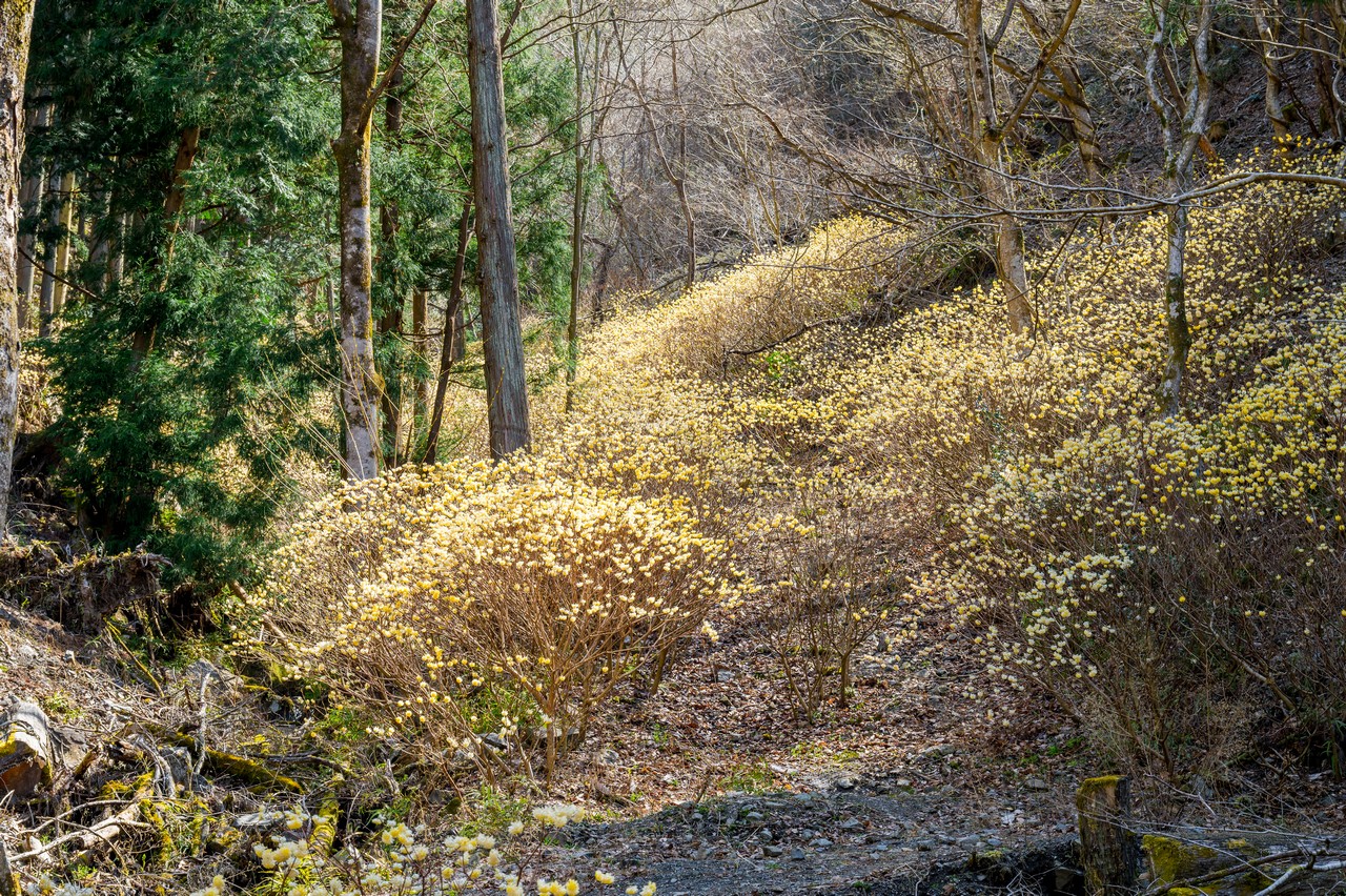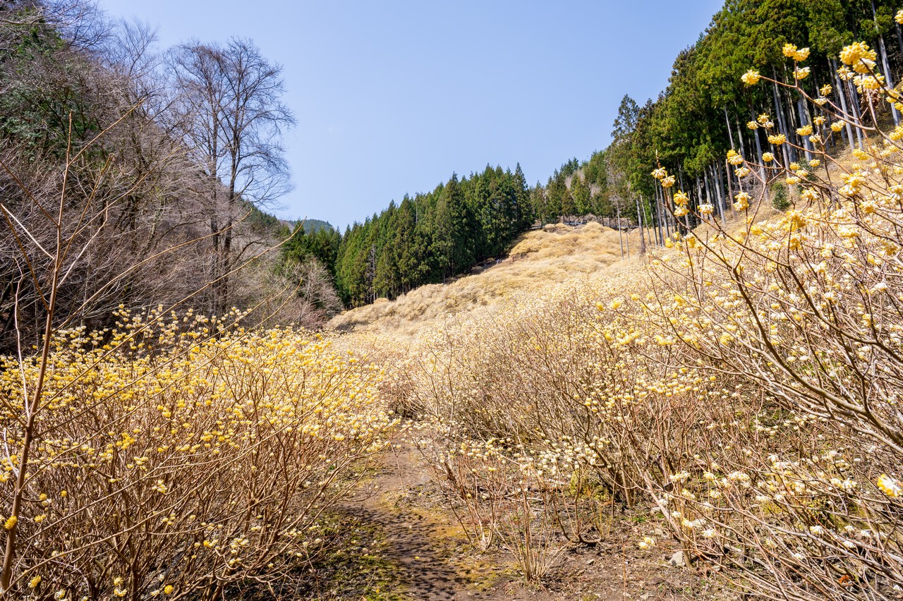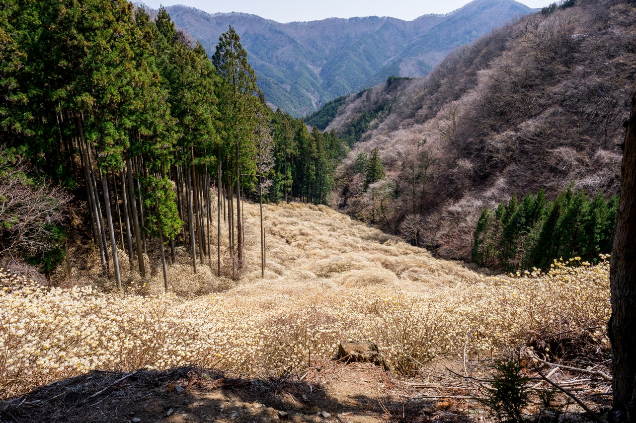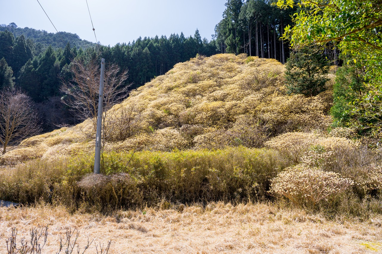 ミツマタがそこかしこに咲いています。これだけでも十分に壮観ではありますが、この先の群生地はもっと凄いので、もったいぶっていないで先に進みましょう。