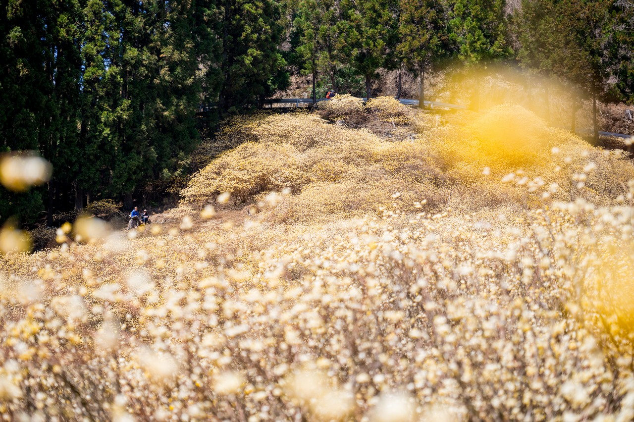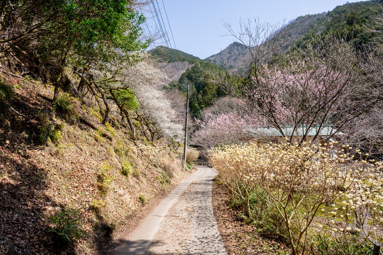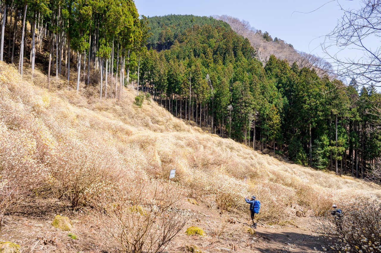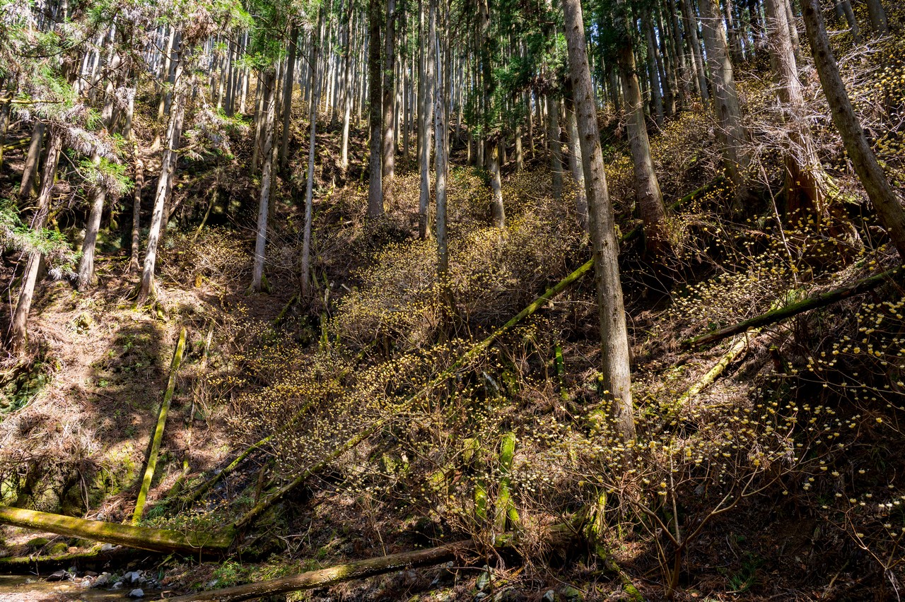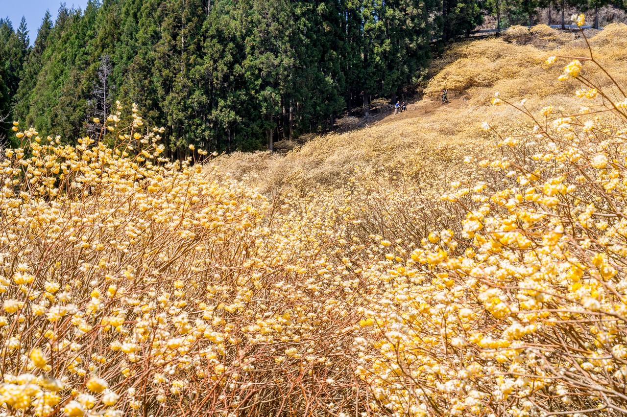 ミツマタがそこかしこに咲いています。これだけでも十分に壮観ではありますが、この先の群生地はもっと凄いので、もったいぶっていないで先に進みましょう。