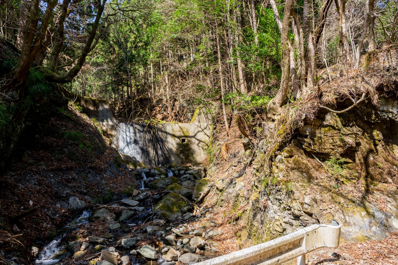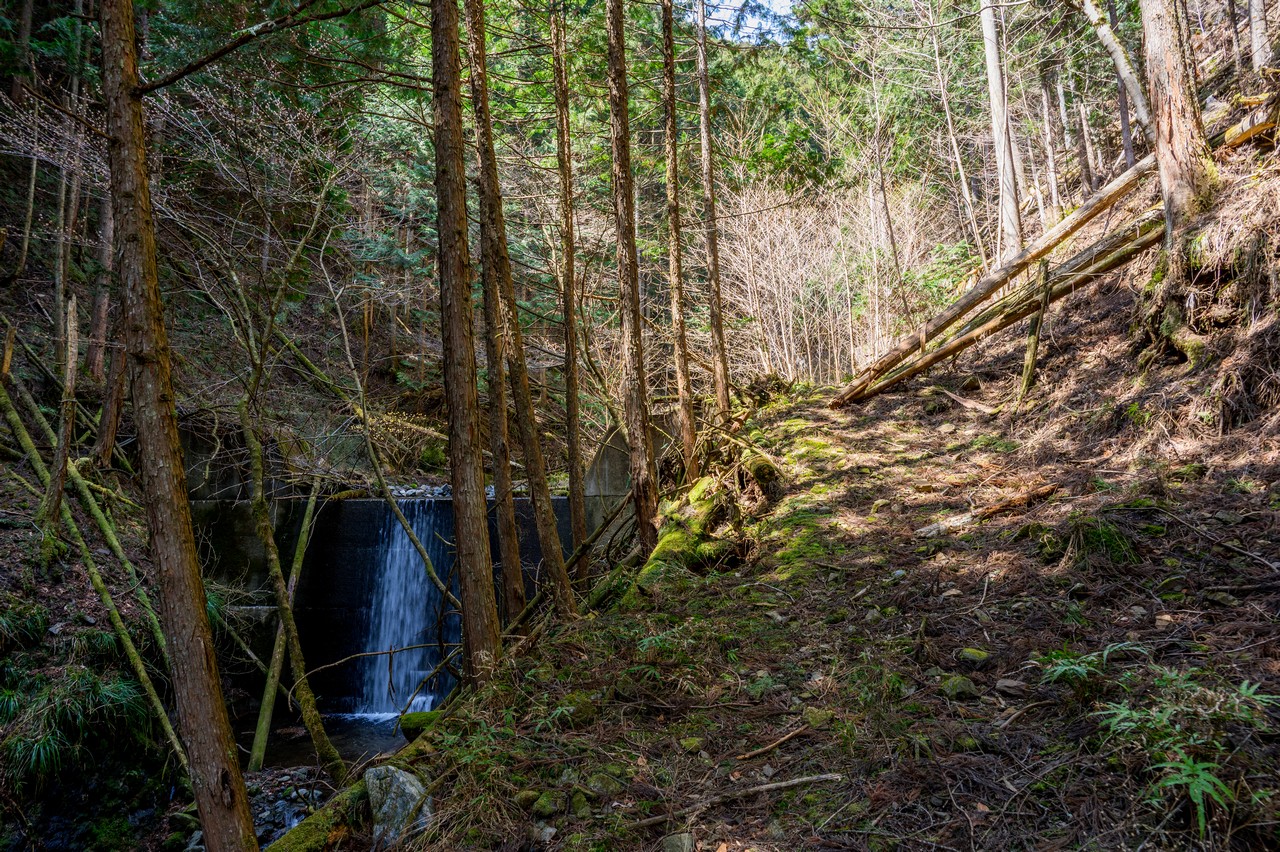 未舗装のダートですが、軽トラでも通行できそうな幅の道になりました。沢沿いに砂防堰堤が並んで立っており、どうやらこの堰堤工事のための作業道であったようです。
