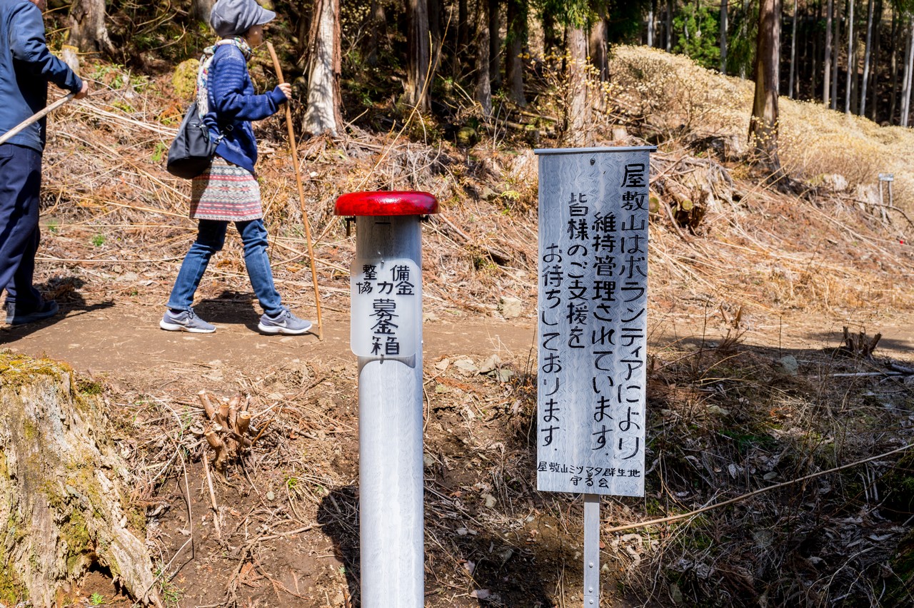 この屋敷山は屋敷山ミツマタ群生地を守る会と言うボランティア団体によって管理されています。協力金箱が置かれているので、この光景に感銘を受けた人はいくらか募金して行きましょう。
