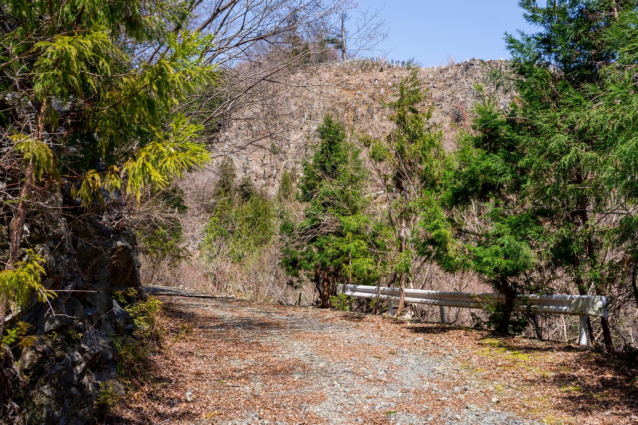 林道が大きくカーブしている地点のガードレール脇から、山中へと分け入って行きます。