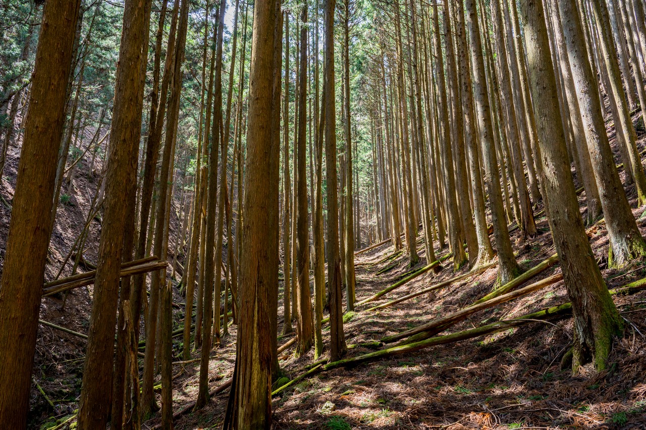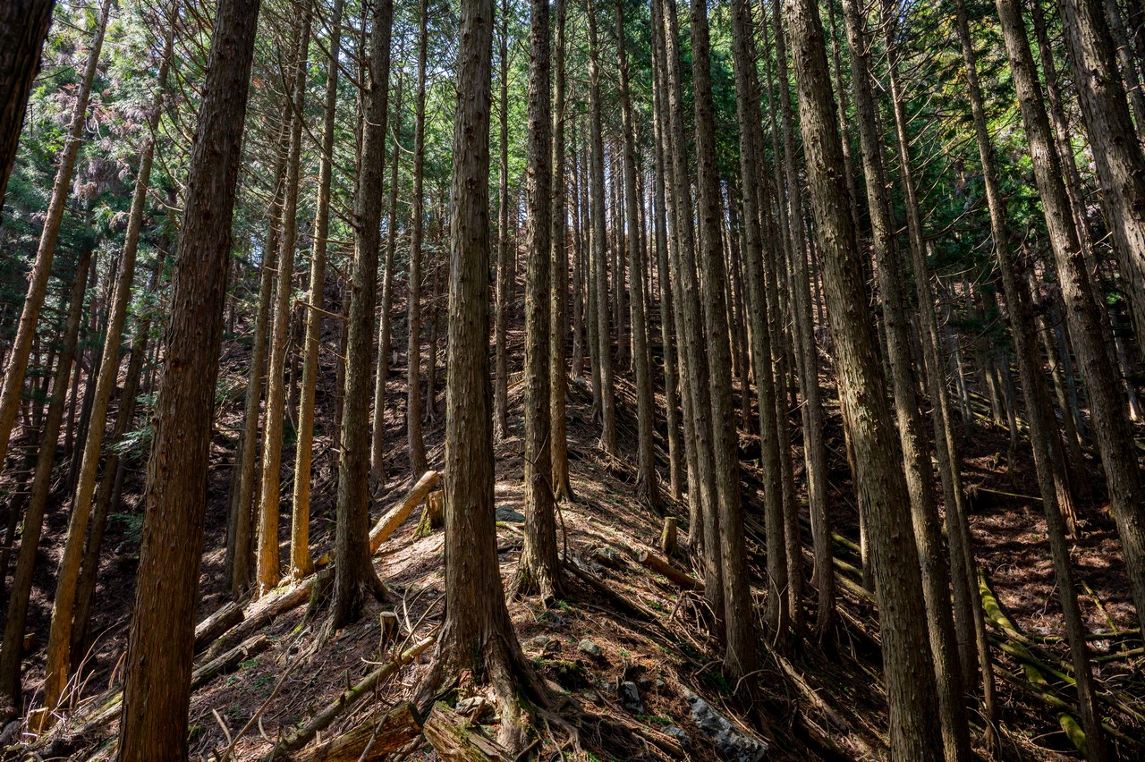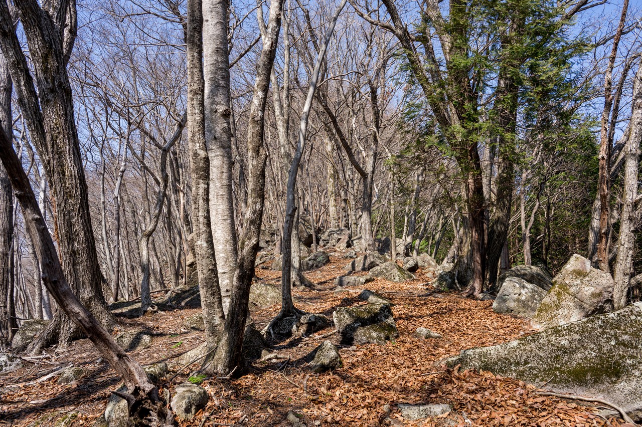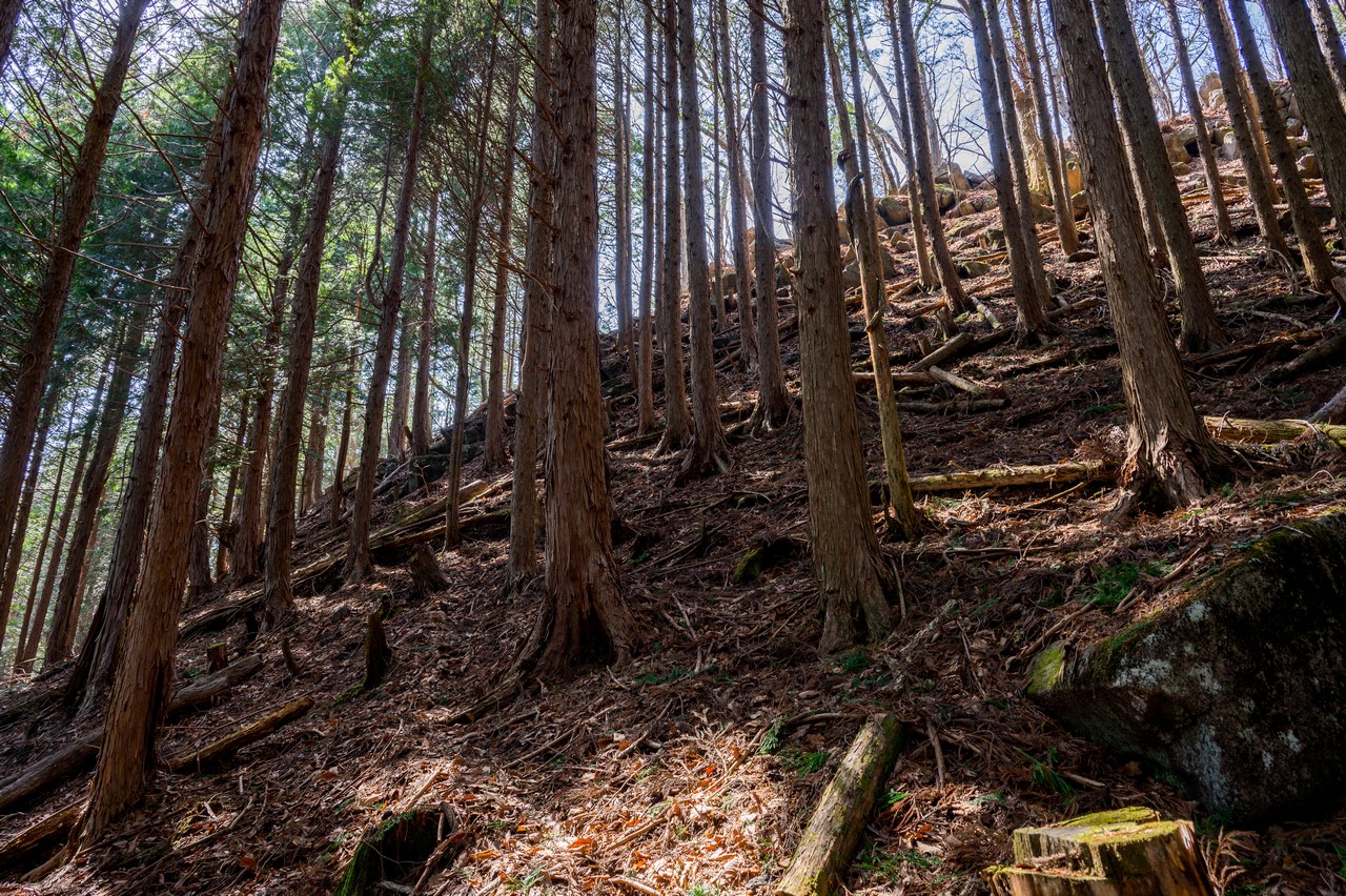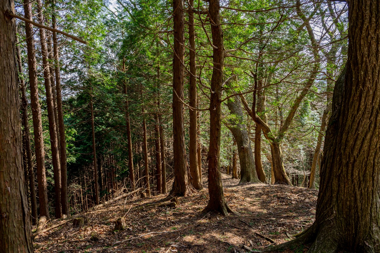 なんとか三境山がある尾根上まで登って来ました。ここまでの薄暗い杉林からは一転して、明るい広葉樹林が広がっていました。