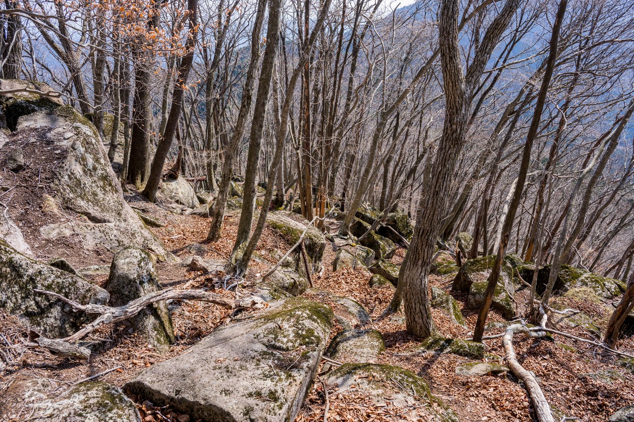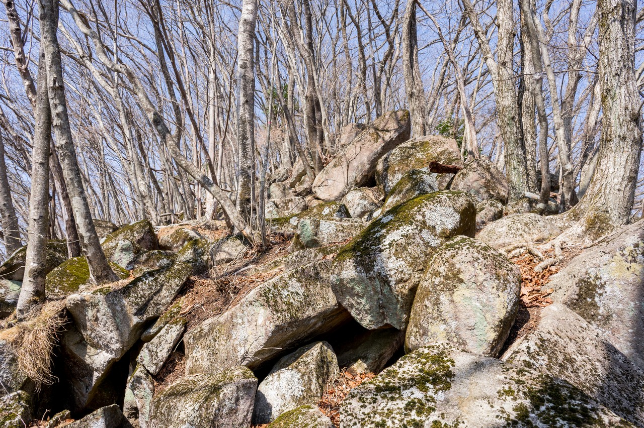 山頂の直下は巨大な石がゴロゴロと転がっており、手も使ってよじ登ります。一応は踏み跡らしきものがありますが、あまり歩かれてはいなさそうな雰囲気です。