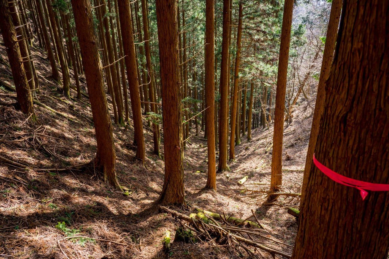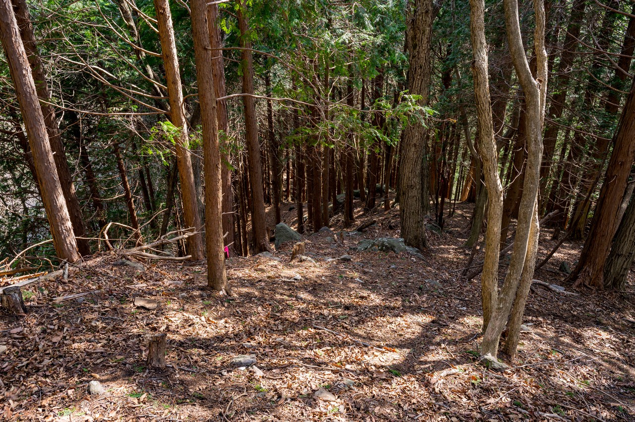 まずは尾根沿いに南へ下って行きます。途中に紛らわしい枝尾根がいくつかありますが、目印のピンクテープがしっかりとあるので周囲をよく観察して進みましょう。