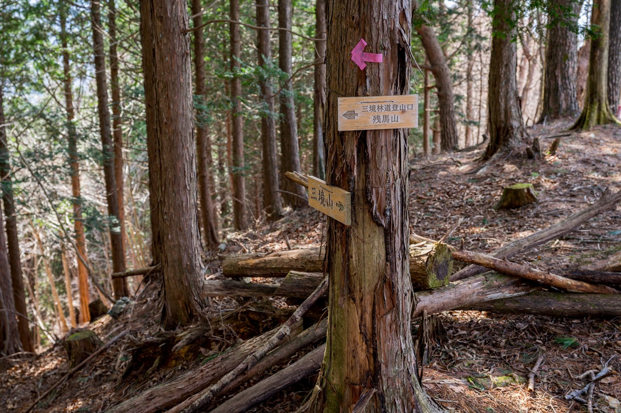 三境山の隣にある残馬山との鞍部まで下って来ました。尾根はこの先にも続いていますが、ここから針路を右に転じます。