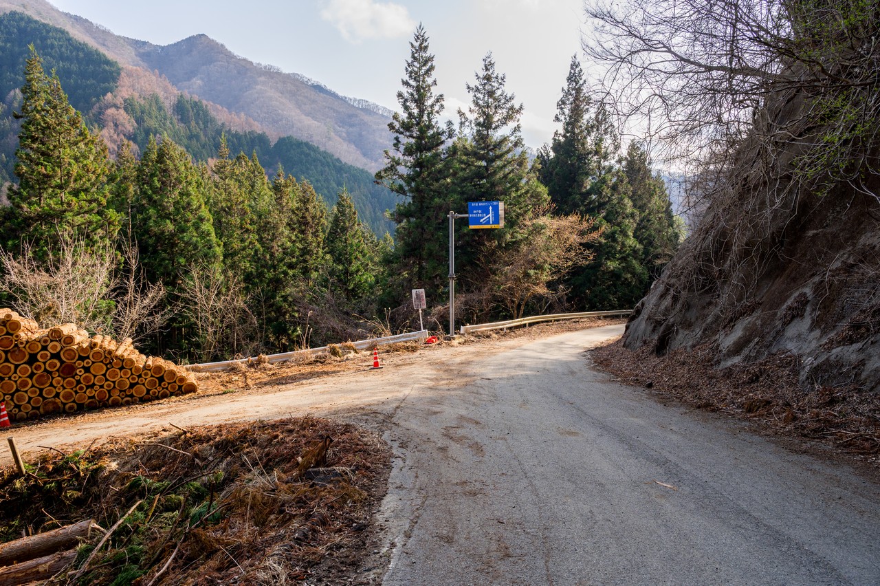 すぐに道の舗装が無くなりダートになりました。この道は林道のようですが、国土地理院の地図上では途中で途切れており、どこを目指しているのかはよくわかりません。