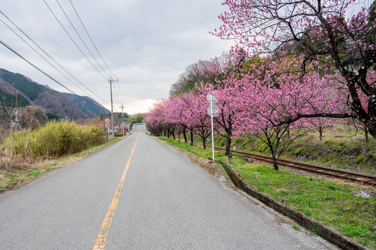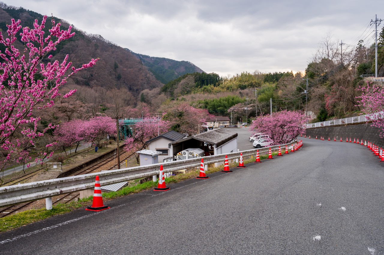 道の脇にわたらせ渓谷鐵道の線路が現れたました。線路沿いに桃花の並木があり、ちょうど見頃を迎えていました。