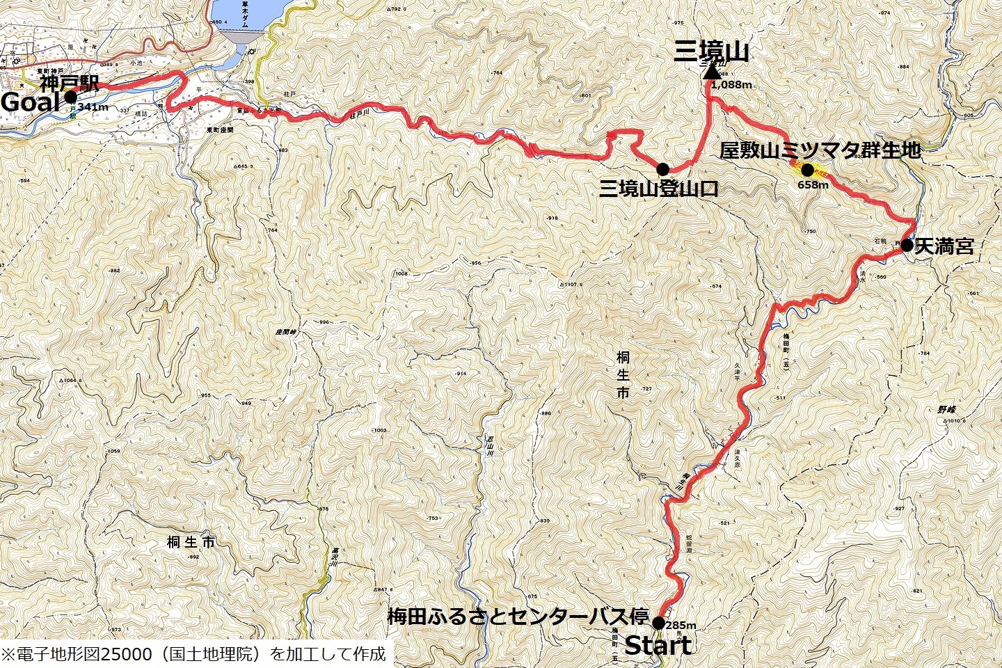 梅田ふるさとセンター(9:30)-天満宮(10:50)-屋敷山ミツマタ群生地(11:55~12:20)-三境山(13:50~14:10)-三境山登山口(15:20)-神戸駅(17:05)