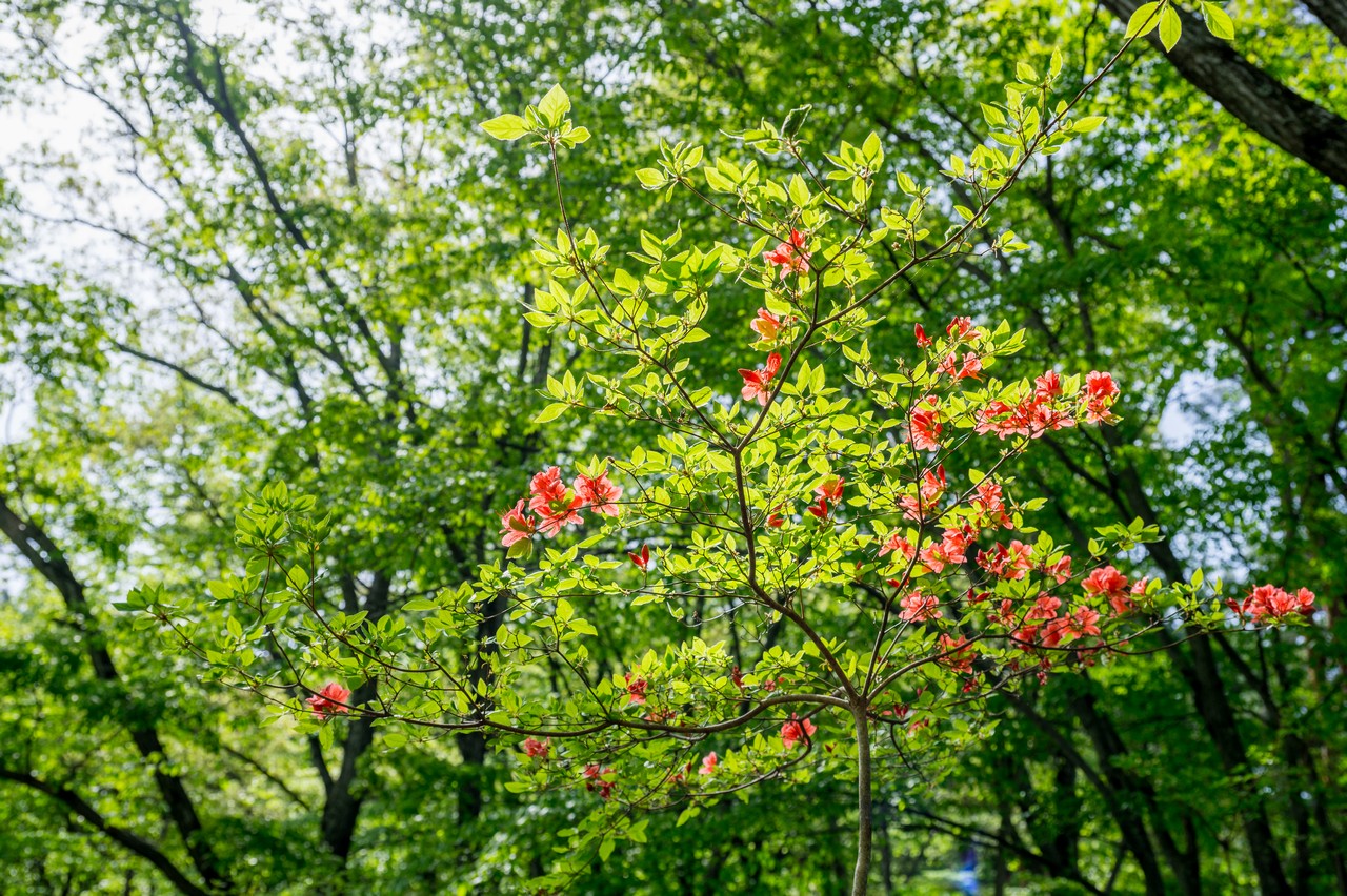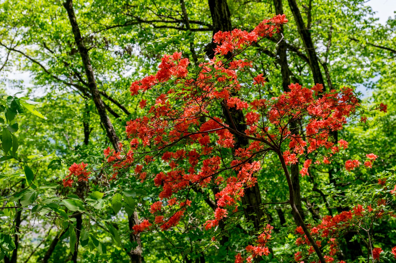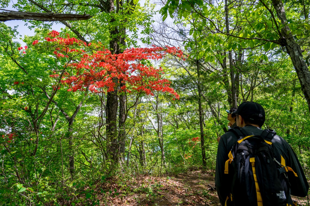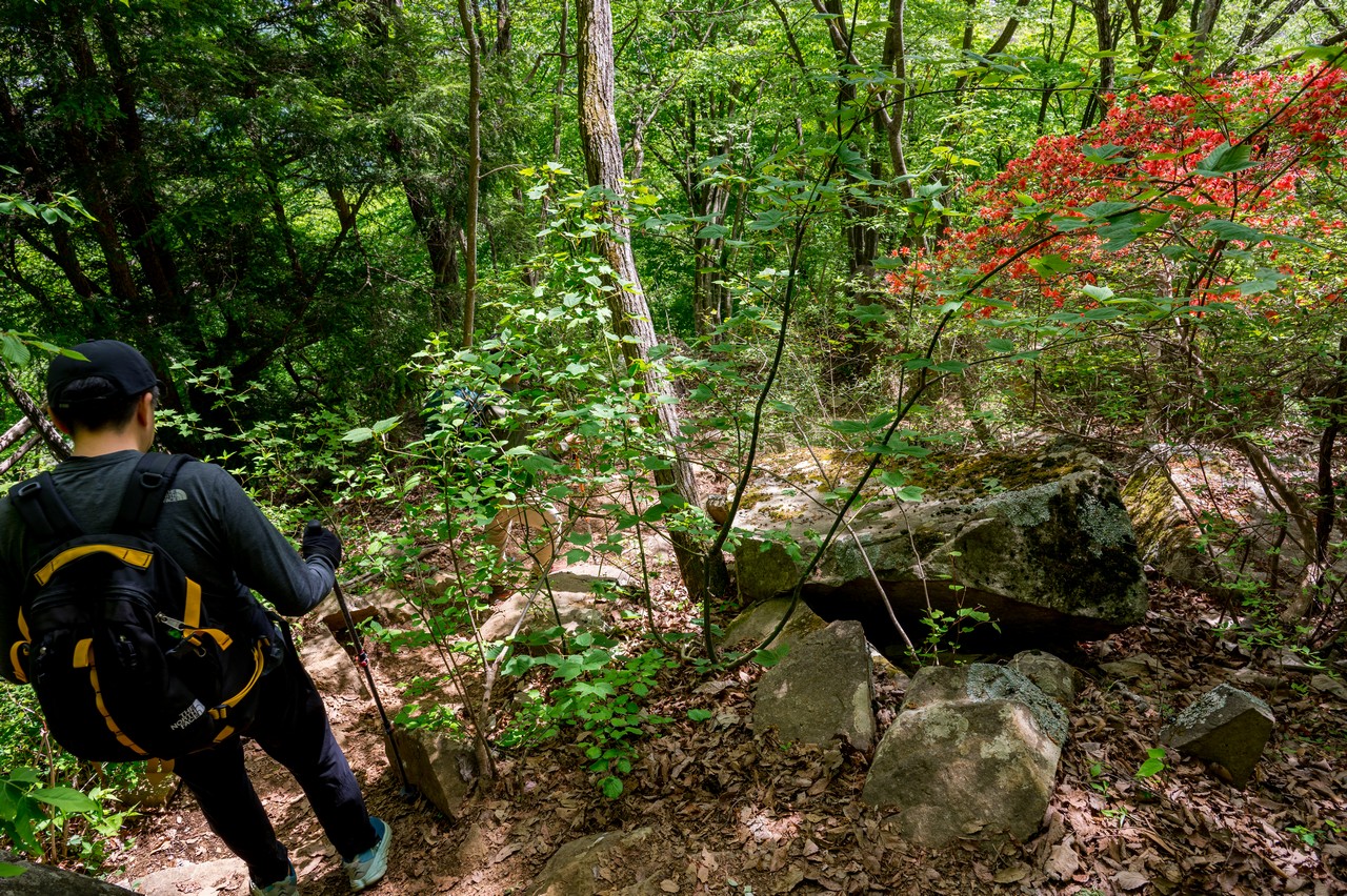 今回は新緑シーズンも真っ盛りなゴールデンウィーク中の訪問です。葉が落ちた冬とは異なり周囲の景色の見通しは悪くなりますが、その代わりだとでも言わんばかりに、ヤマツツジが咲き誇っていました。