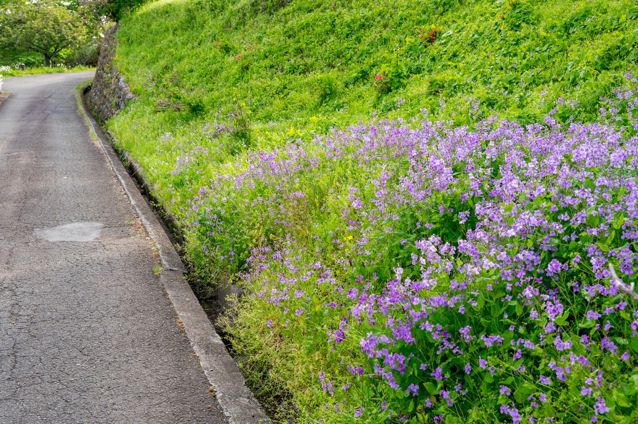 道路の脇の畦に、オオアラセイトウがこれでもかと言わんばかりに咲いていました。うーん、春ですねえ。