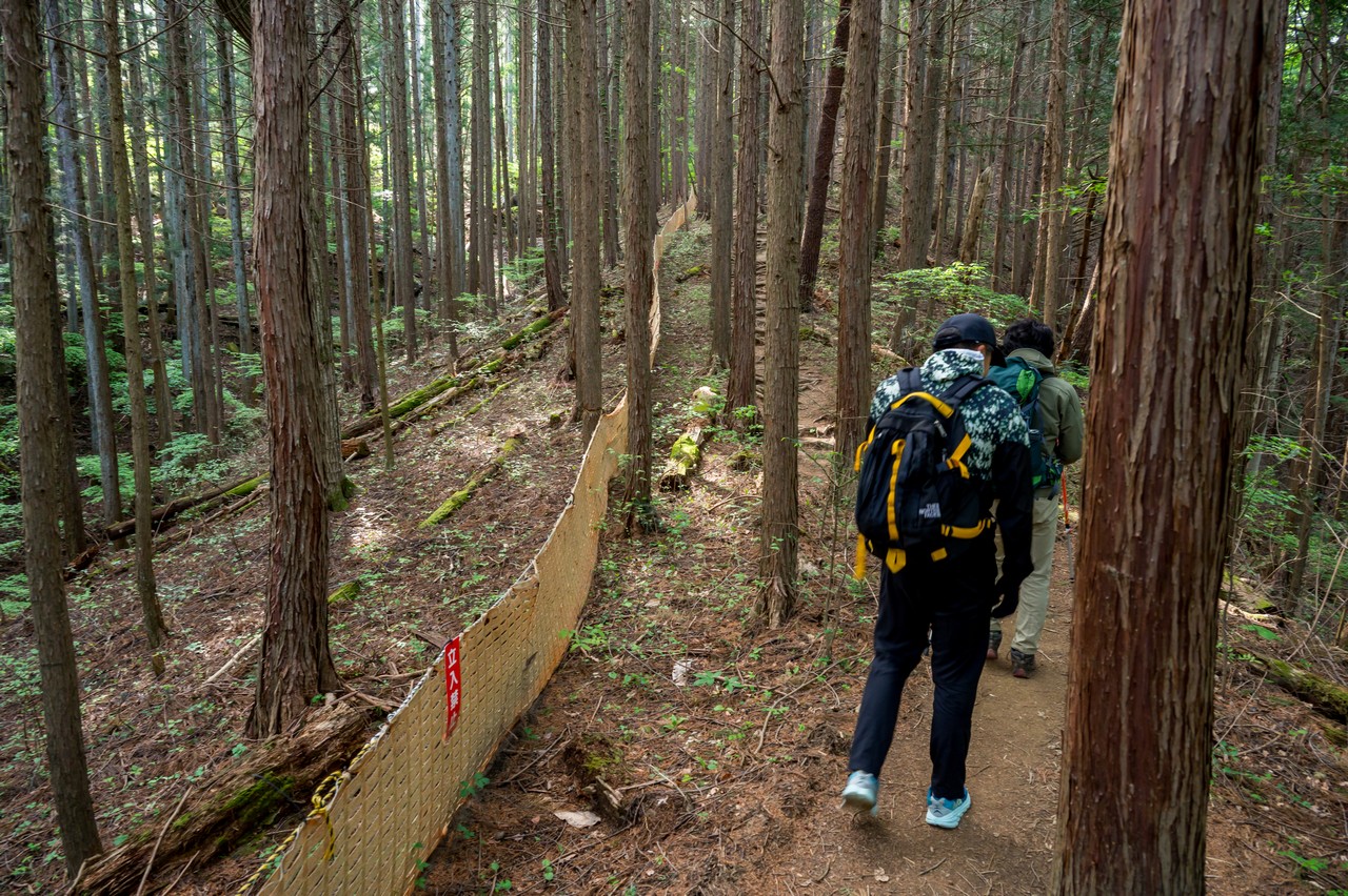 木の隙間から富士山がお目見えしました。山頂まで行けばもっとババーンと見えるので、喜んでいないで先へ進みましょう。