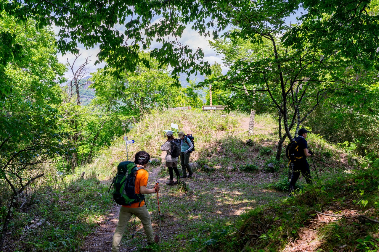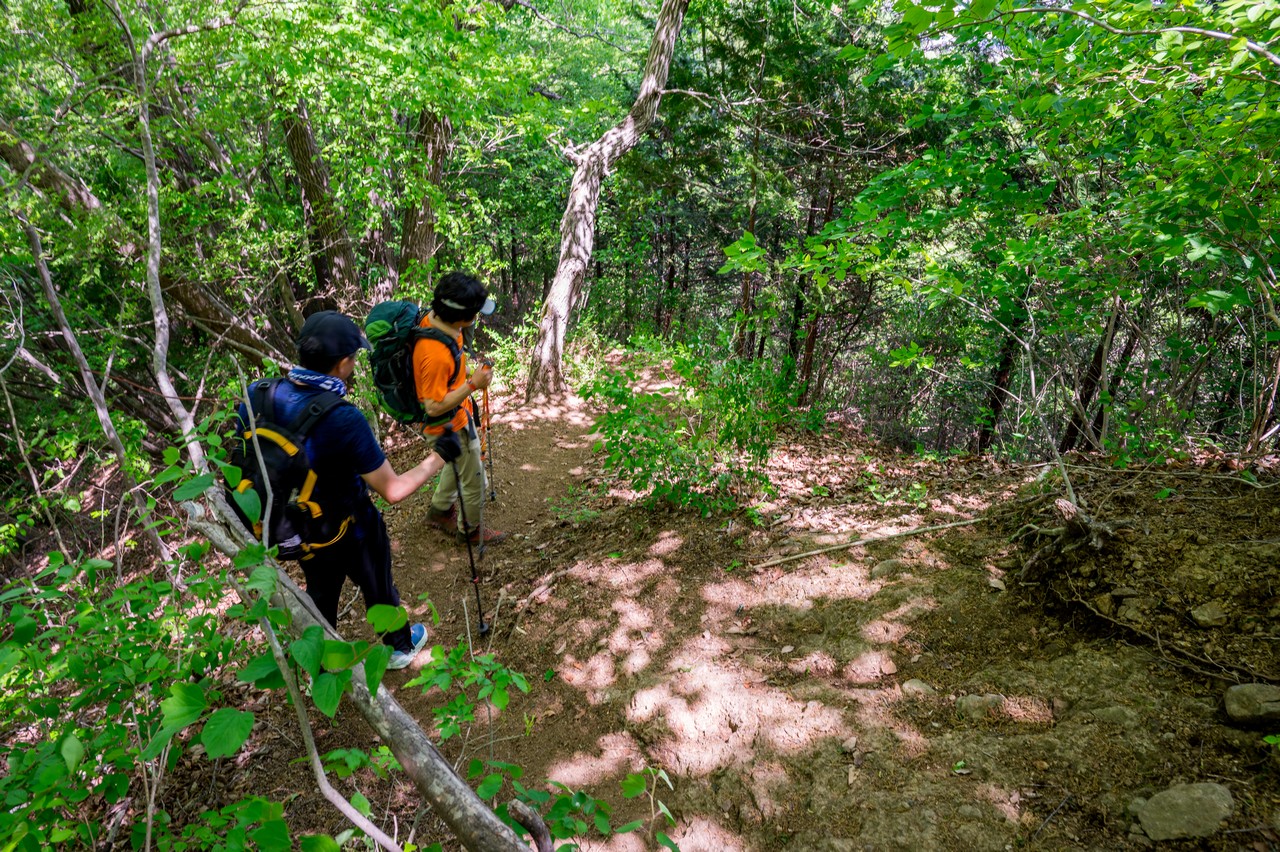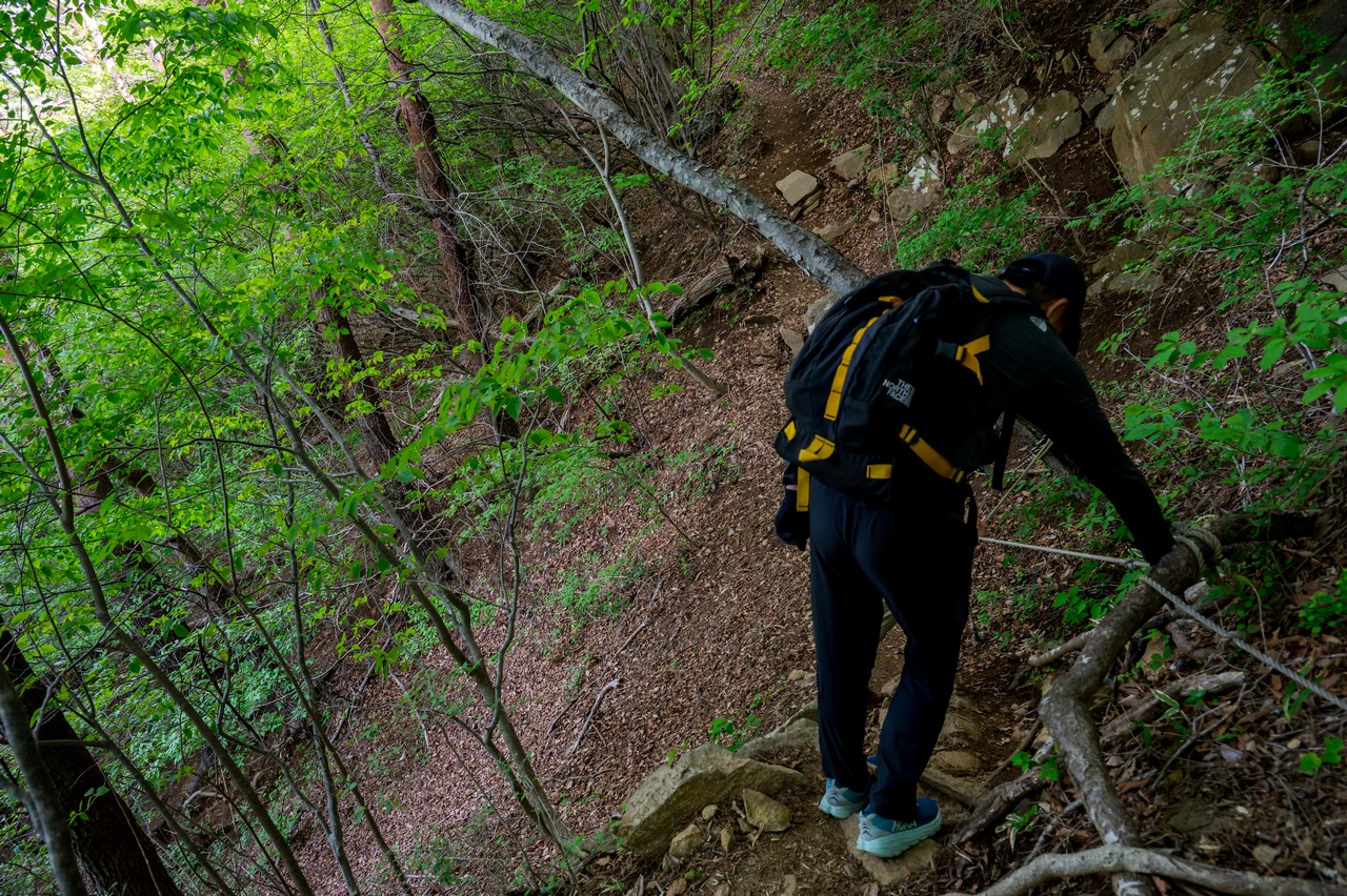 烽火台跡を過ぎると、尾根は大きく標高を落とし始めました。なかなかの急勾配なので、一歩一歩足場を確かめながら丁寧な下山を心がけましょう。