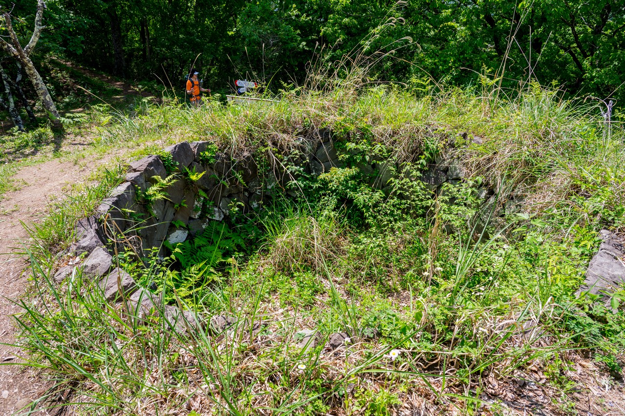 この石垣に囲まれた丸い穴が、大月防空監視哨の遺構です。この穴の中に入ると、遠方から飛来する爆撃機のエンジン音が反響して良く聞こえるのだとか。