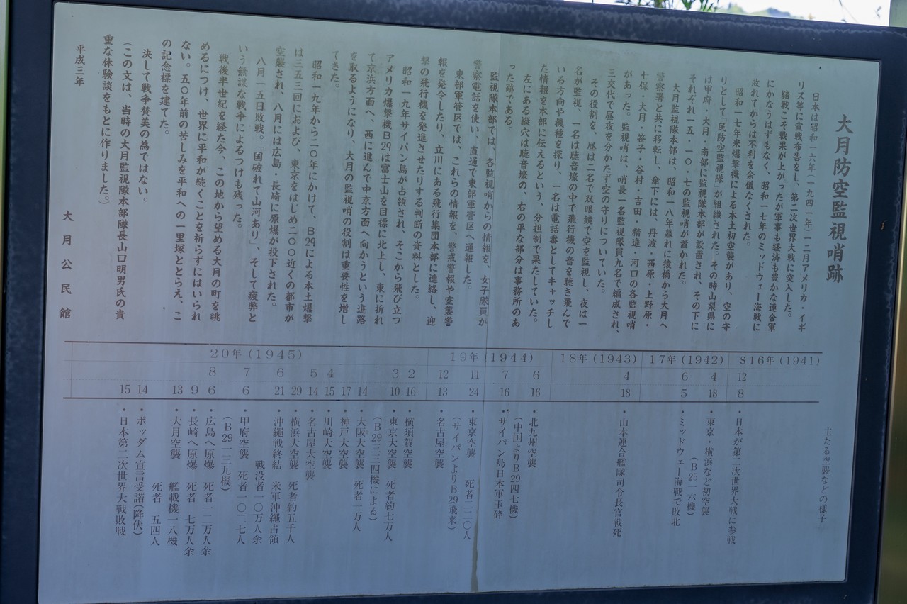 そもそも大月に爆撃の標的にされそうなものはなさそうなものですが、何故ここに防空監視哨が必要なのかという疑問に答えるかのように、詳細な記述がされた案内板が置かれていました。