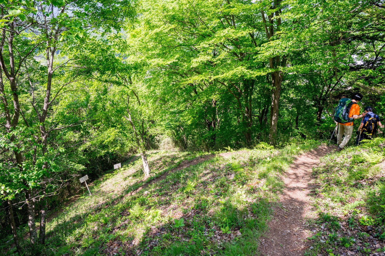 山頂に近づくと、周囲は薄暗い杉の植林から、ナラやブナなどの広葉樹林に変りました。森の雰囲気が明るくなり、気分も盛り上がって来ます。