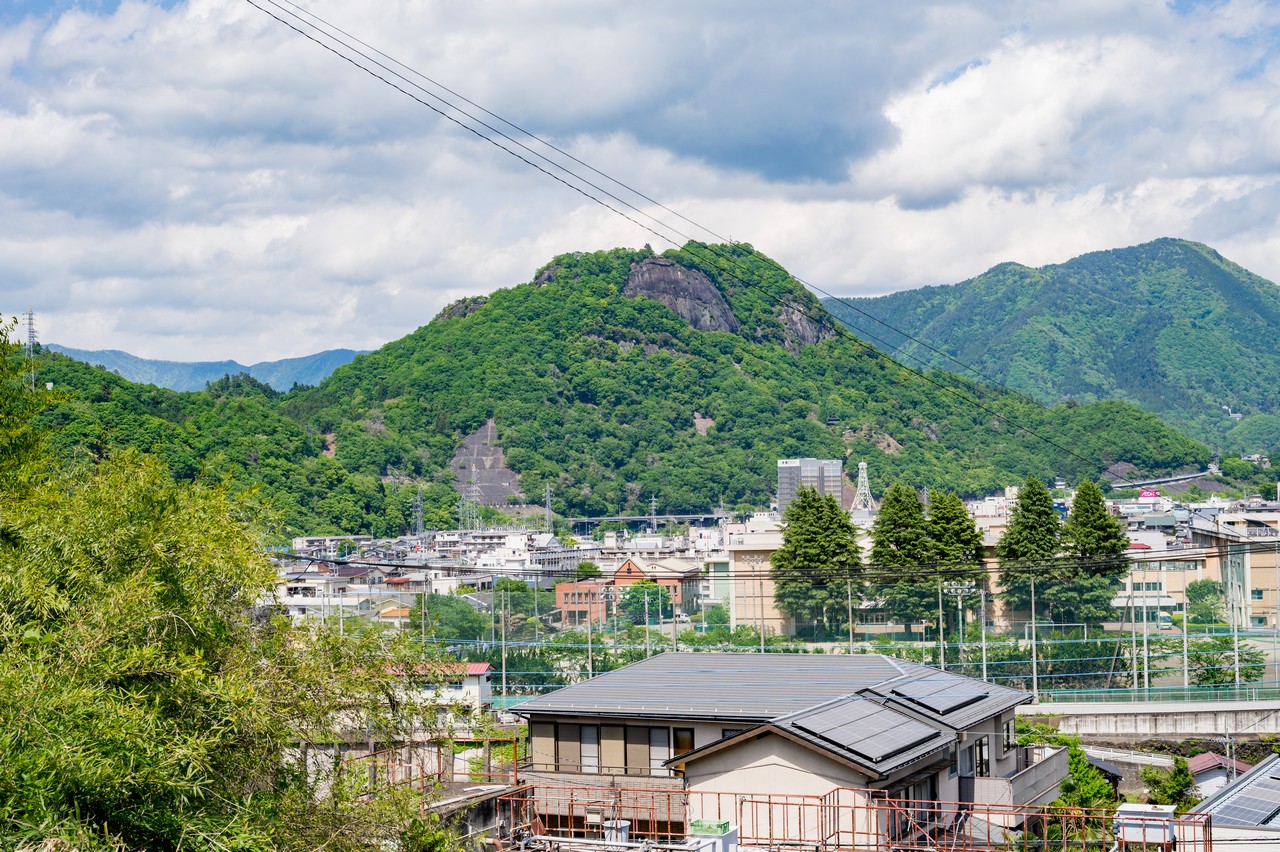 むすび山からの下山はあっという間に終わります。街中まで下りてくると、正面に大月のシンボルである岩殿山(634m)の姿が良く見えました。